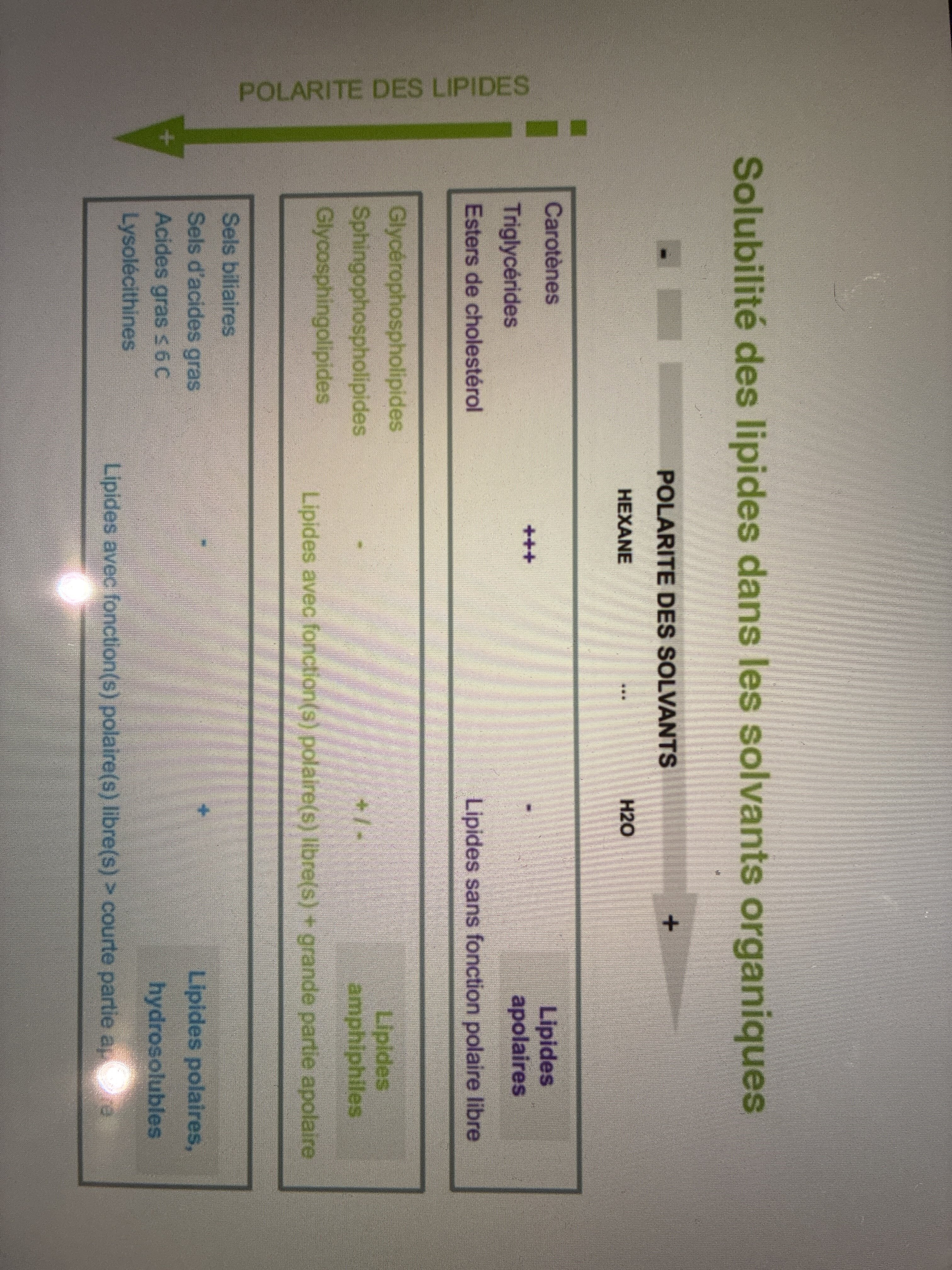 Responsable Matière Solution Mathnifique Posted November 5 Responsable Matière Solution Posted November 5 4 hours ago, EtudianteUnivPASS said: bonjour, je ne comprends vrm pas quels lipides sont hydrosolubles et lesquels ne le sont pas, et quel est la logique pour le savoir svp ? J’ai également du mal à comprendre lesquels sont amphotère et lesquels sont amphiphiles ? Merci bcp Salut ! Alors pour ce qui s’agit des lipides hydrophobes et hydrophiles ducoup ça va dépendre de ce que tu as dans ta molécule. Par exemple les triglycérides, sont la compilation d’un glycérol et de trois acide gras qui sont apolaire donc c’est fortement apolaire (hydrophobe). À l’inverse, les sels biliaires qui sont fortement polaires sont très hydrophiles. Ainsi certains sont entre deux, comme les sphingophospholipides et sont donc décrit comme amphiphiles. Voici la diapo de la prof si je me trompe pas. Rayanodipine, ju.gulaire and EtudianteUnivPASS 2 1 Quote