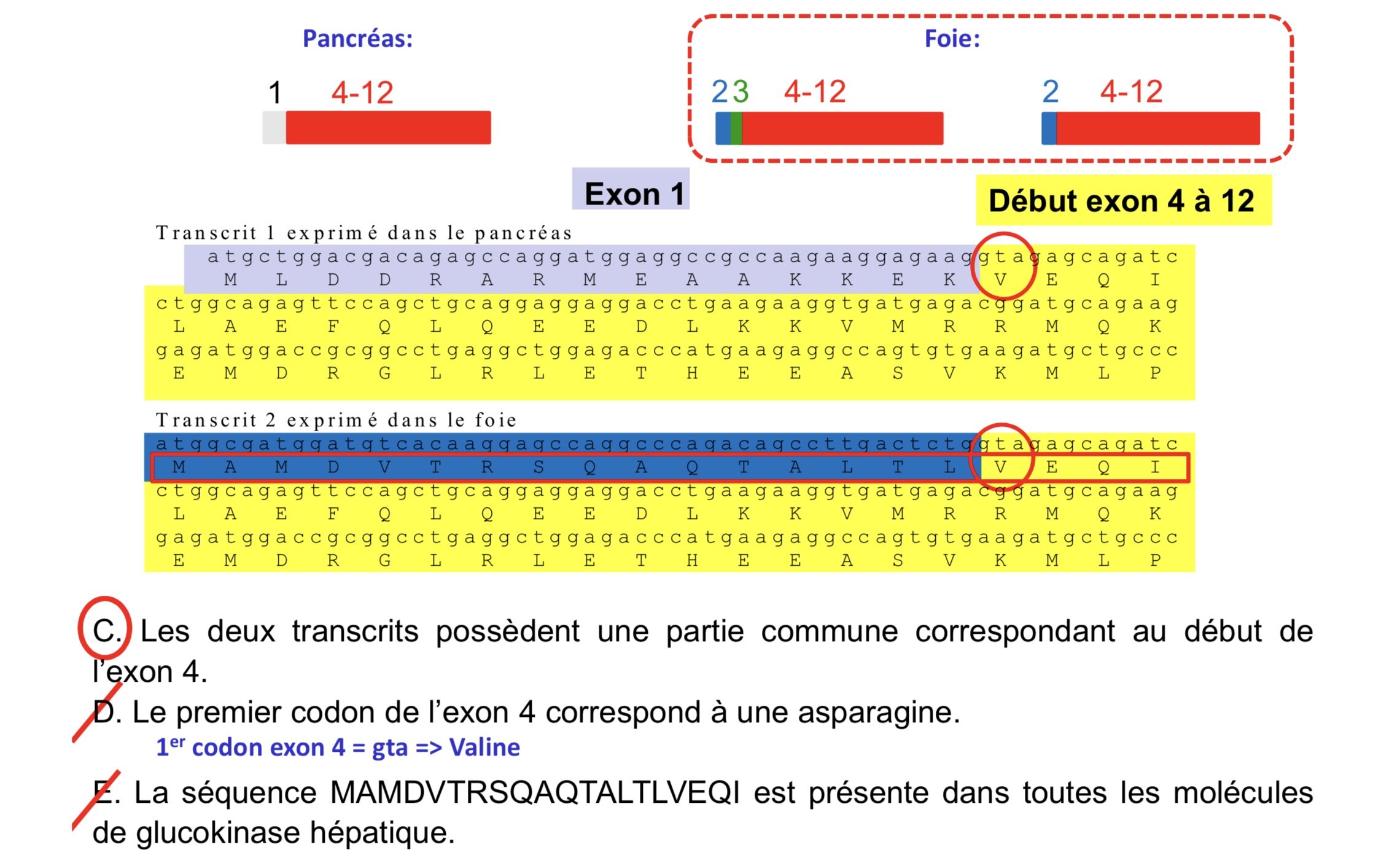 Tuteur Solution Penicilline Posted November 6 Tuteur Solution Posted November 6 Pour l'item E. Dans l'énoncé on te dit que dans le foie il y a deux séquences : - exon 2+ Exon 3 + Exon 4-12 - Exon 2 + Exon 4-12 Or la séquence présentée de l'item correspond à celle de l'exon 2 (bleu) + début de l'exon 4-12 (jaune) Ce qui est faux dans cet item c'est le "toutes les glucokinases hépatiques" => c'est seulement une partie. jujéjunum and Enroutesimone 2 Quote