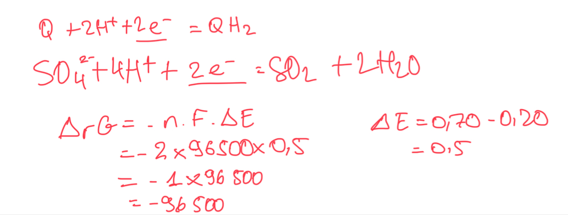 bibo Posted November 7 Posted November 7 bonjour, je suis entrain de corriger l'examen blanc qu'on a eu et y'a certains items avec lesquels je bloque. - "Concernant la réaction de dimérisation du dioxyde d'azote : 2 NO2 (g) = N204 (g), donnez le caractère vrai ou faux de chacune des propositions suivantes : Données : à 25°C, dans les conditions standard, ArH° = - 70 kJ.mol' et ArS°= - 200 J.mol-1.K." B. Pour cette réaction, l'expression de la variation d'enthalpie est : ArH° = ArU® - RT. voici l'item et je comprends pas pourquoi on fait -RT alors que la formule est deltaH = deltaU + delta nRT et qu'on passe de deux moles de gaz à une moles donc n vaut 1 non ? - "Concernant le dioxyde de soufre SO2, donnez le caractère vrai ou faux de chacune des propositions suivantes : Le SO2 est utilisé comme conservateur et antioxydant. Il peut, par exemple, régénérer les composés de type hydroquinone à partir de leur forme oxydée (quinone). Données : E° (Q/QHz) = + 0,70 V (demi-équation redox ci-contre) E° (SO4(SO2) = + 0,20 V F = 96500 C.mol-1" E. La variation d'enthalpie libre dans les conditions standard (ARG") de la réaction spontanée est égale à -96500 J. voici l'item et je n'arrive pas à comprendre comment on arrive à ce résultat voila merciii Quote