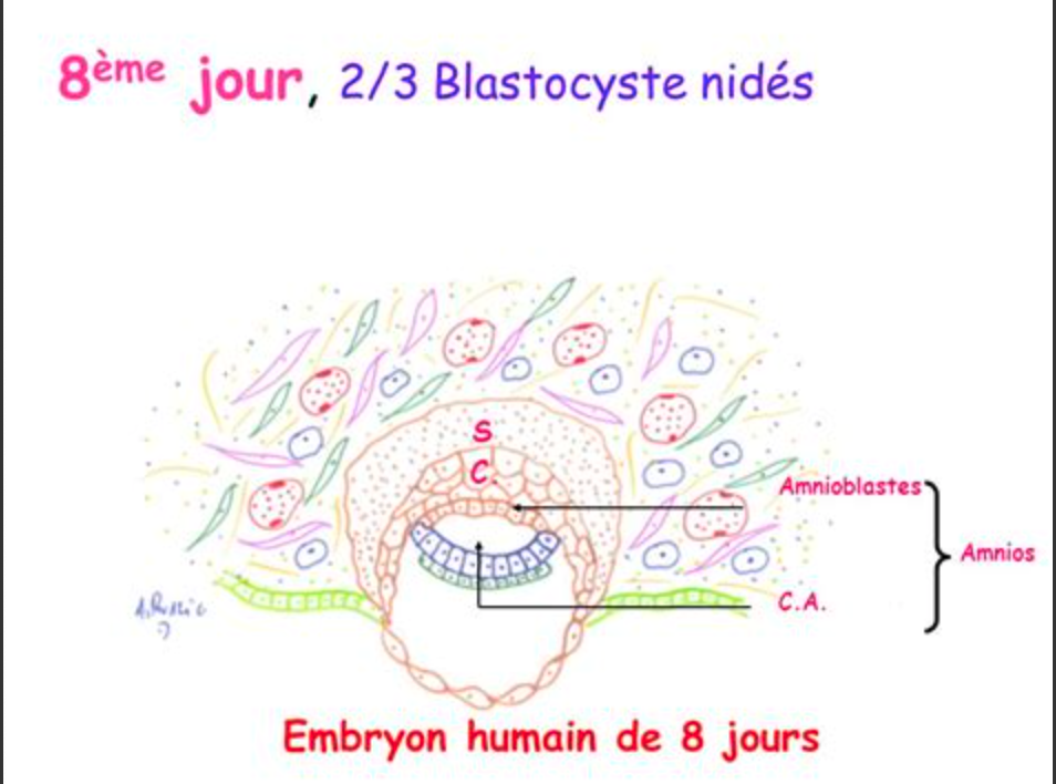 letartare06 Posted November 8 Author Posted November 8 il y a 2 minutes, Daryanémie a dit : coucou @letartare06 ! je t'envoie un schéma trouvé sur internet de l'embryon à 8 jours afin d'avoir une illustration pour les explications que je vais donner. Ici le MCI a déjà "disparu", dans le schéma, ce qu'on voit au centre c'est le disque embryonnaire bilaminaire (avec épiblaste, couche du haut en bleu, et hypoblaste qui est la couche du bas). Donc le MCI ne sépare rien, il s'est transformé. La cavité amniotique se forme au dessus de l'épiblaste, pas du côté de l'hypoblaste. Donc je pense que la lame basale qui sépare l'hypoblaste et la cavité amniotique (comme on le voit sur le schéma) c'est l'épiblaste (qui est bien entre l'hypoblaste et la cavité amniotique). je ne sais pas si je suis bien claire alors peut etre qu'un autre tuteur aura des choses à rajouter mais j'espère avoir pu t'aider ! Passe une bonne journée !! Si si c'est claire merciii Daryanémie 1 Quote