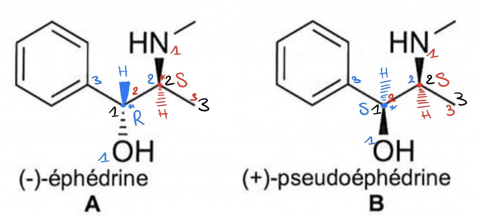 Tuteur Solution caro.tide Posted November 10 Tuteur Solution Posted November 10 Salut ! Je te montre ce que j'ai fait en t'expliquant ça sera plus simple je pense. Pour la molécule A: Tout d'abord il faut que tu trouves le ou les carbones asymétriques dans la molécule. Ici, ce sont les carbones 1 et 2 (que j'ai noté avec une astérisque). Ces carbones sont numérotés en fonction de la chaîne carbonée (le cyclohexane ne compte pas dans la chaîne) et de la fonction principale, dans ce cas la fonction alcool, qui aura donc la numérotation la plus petite possible. Ensuite, pour chaque carbone asymétrique, il faut que tu numérotes les atomes qui y sont liés par numéro atomique décroissant. Si deux atomes sont les mêmes, il faut regarder l'atome qui suit. Pour le C1: O > C (lié à N) > C (lié à d'autres C) > H Pour le C2: N > C (lié à O) > C (lié à des H) > H Je t'ai noté les H liés aux C* qui sont sous‐entendus. Ces H (numéroté 4) doivent être en arrière pour trouver la configuration, ou s'ils sont devant, fait la configuration en faisant comme s'il était derrière et tu inverses ta configuration à la fin. Il faut maintenant voir dans quel sens ça tourne lorsque tu fais 1->2->3. Si c'est dans le sens des aiguilles d'une montre, le C est de configuration R. Au contraire, si ça tourne dans le sens inverse des aiguilles d'une montre le C est S. Pour le C1: faire 1->2->3 tourne dans le sens inverse des aiguilles d'une montre mais le H est en avant donc on inverse la configuration. Le C1 est donc de configuration R. Pour le C2: on voit que faire 1->2->3 tourne dans le sens inverse des aiguilles d'une montre et H est en arrière donc le C2 est de configuration S. La molécule est donc bien de configuration 1R, 2S. Je te laisse faire la même chose pour la molécule B, n'hésite pas si tu as besoin d'aide ou si tu as d'autres questions ! J'espère avoir pu t'aider un peu ! Daryanémie, Ankyyrine, Lénadénine and 1 other 2 1 1 Quote