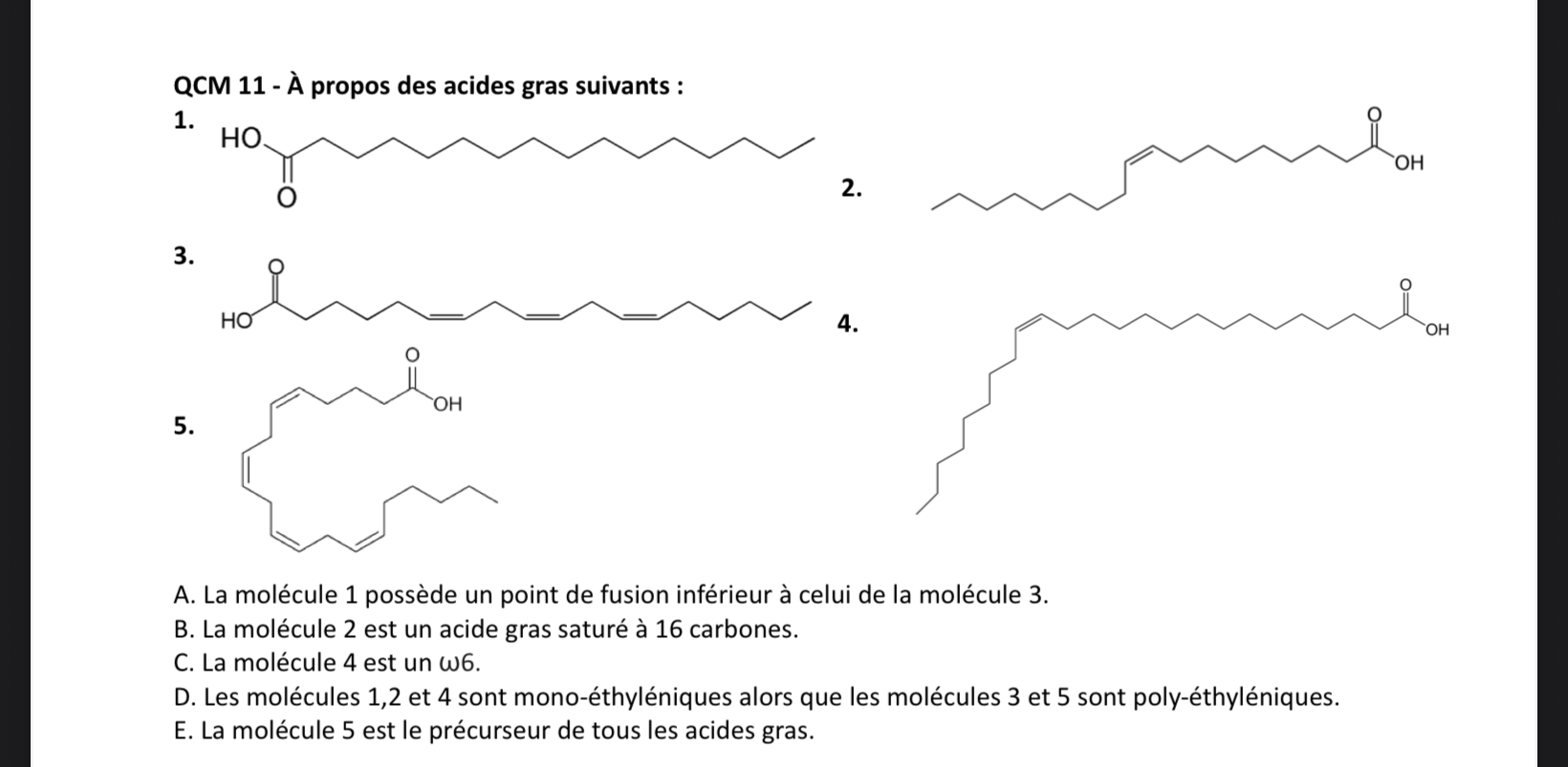 Sead Posted November 12 Posted November 12 (edited) Bonjour à tous, Je faisais les qcm du poly de la libraire sur les lipides, et au qcm 11 j’ai remarqué qu’il y avait des réponses un peu bizarres je sais pas si c’est des erratas : Les réponses sont BE, mais la B la molécule 2 est monoinsaturée pas saturée et pour la E, la molécule 5 c’est le précurseur des eicosanoides pas de tous les acides gras non ? Mercii ! ÉDIT En fait dans les erratas déjà signalés c’est déjà noté autant pour moi désolé ! Edited November 12 by Sead Quote