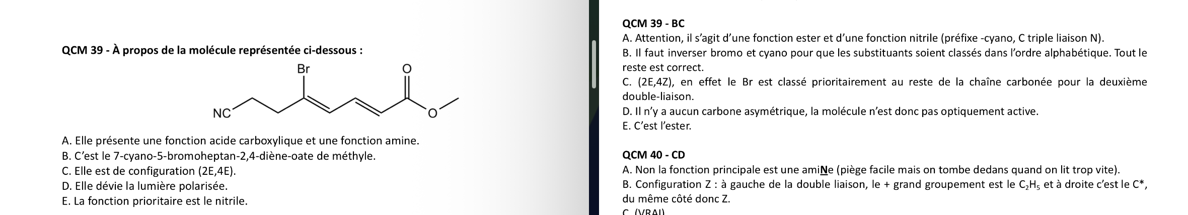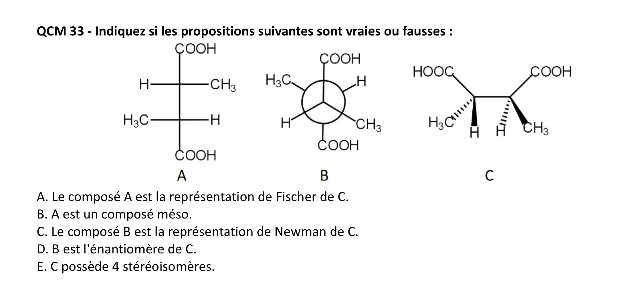 Filouu Posted Wednesday at 08:26 AM Posted Wednesday at 08:26 AM Bonjour, pour le QCM 33 en chimie orga(qcm supplémentaires) l’item E est noté faux et concerne la molécule C mais dans la correction on nous parle de la molécule B est ce que quelqu’un peut donc me dire si c’est vrai ou faux. Pour moi c'est vrai car on a 2C asymétriques donc : 2^2 =4 et il est aussi SS, si on nous demandait pour B il y en aurai eu 3 car la molécule est RS Quote