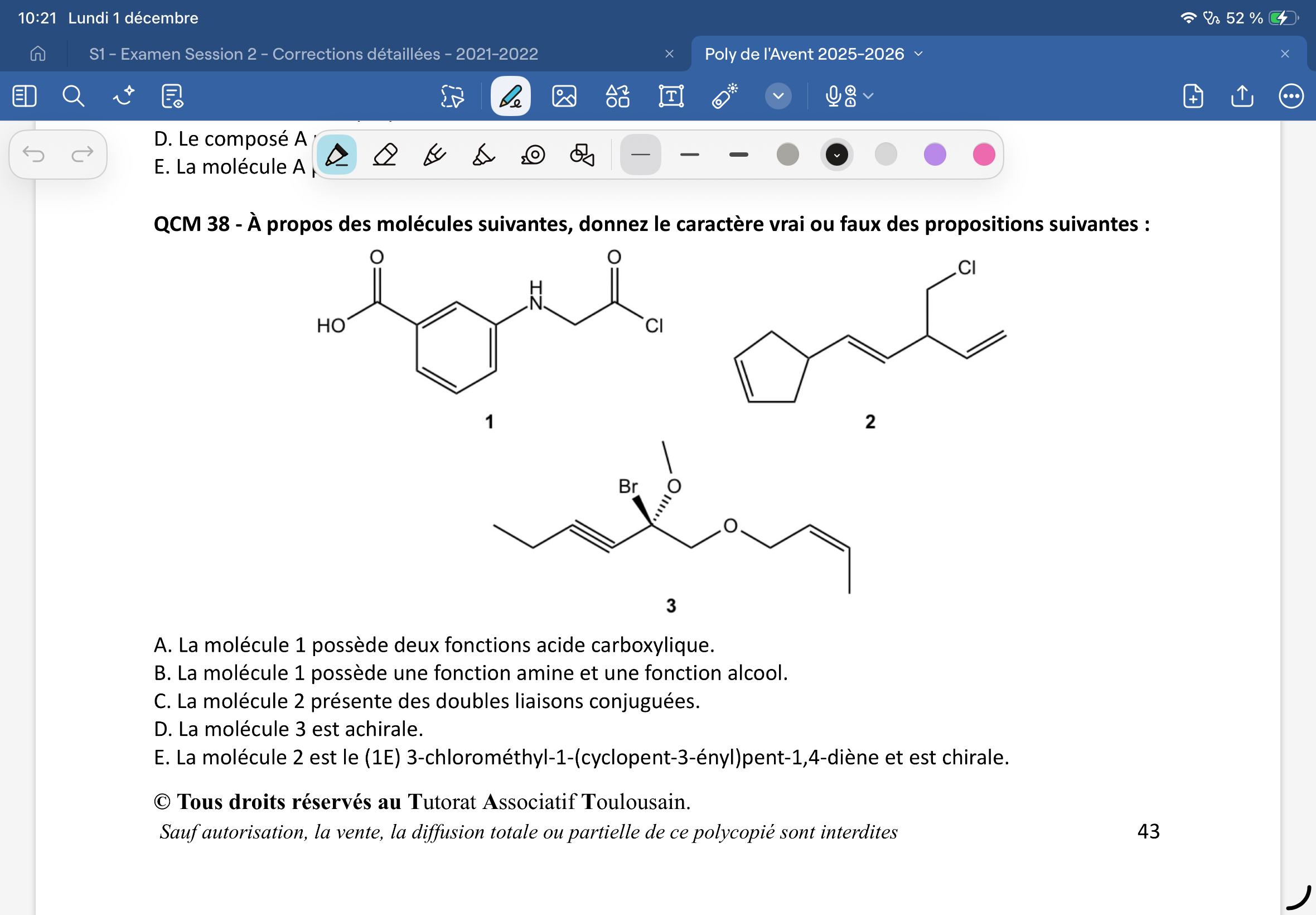 zblorbe Posted Wednesday at 08:55 AM Posted Wednesday at 08:55 AM Salut dans le QCM 10 du sujet 2 je comprends pas pourquoi la molécule C est pas SS ? Si quelqu'un pouvait me dire comment il a fait ca m'aiderait bien Merci d'avance! Quote