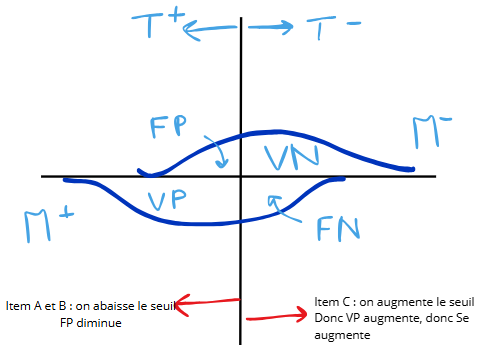 Responsable Matière jooo Posted Wednesday at 06:53 PM Responsable Matière Posted Wednesday at 06:53 PM Il y a 3 heures, J.L.D a dit : Bonjour, j'ai plusieurs questions pour le sujet 3, pour les QCM 1, item B, et 5, items A, B et C. QCM 1 - On décide de mesurer la glycémie capillaire à jeun chez 60 patients à l’aide d’un lecteur de glycémie. B. Certains patients ont mangé une petite collation avant la mesure sans le signaler. Ces conditions de mesure entraînent un manque de précision. Et la correction : B. Manger avant la mesure ne change pas la régularité, seulement la valeur mesurée. Mais le fait que certains patients mangent, cela ne devrait pas disperser les valeurs (puisque d'autres ne vont pas manger), et donc augmenter la dispersion des valeurs, et donc au final diminuer la précision des mesures ? Et QCM 5, il me semble que c'est l'inverse pour les items A, B et C, car le test est positif si la moyenne de sommeil est inférieure au seuil, donc on devrait inverser ce qu'il y a dans le cours. En tous cas c'était ce que j'avais compris QCM 5 - On souhaite savoir si les étudiants en PASS dorment assez, pour ce faire on étudie pendant 1 mois leur tendance de sommeil, de manière à dénombrer le nombre d’étudiants en carence de sommeil. Si leur moyenne d’heures de sommeil par nuit est inférieure à 7h, alors le test est considéré comme positif. Indiquez si les propositions suivantes sont vraies ou fausses : A. Si le seuil de détection de la carence est abaissé, alors le nombre de faux négatifs augmente. B. Si le seuil de détection de la carence est abaissé, alors le nombre de faux négatifs diminue. C. Si on augmente le seuil de détection, alors la sensibilité diminue. Correction : QCM 5 - BCE A. Voir item B Merci d'avance, et merci pour le poly Salut ! alors pour l'item B du QCM 1 tu as raison de dire que si certains patients mangent et d’autres non, ça va rendre les résultats plus dispersés dans le groupe. Mais ça ne veut pas dire que le lecteur de glycémie est moins précis. La précision c’est juste : est-ce que l’appareil donne des résultats proches quand on mesure la même chose dans les mêmes conditions ? Ici, ce n’est pas l’appareil qui change, c’est la glycémie des patients qui n’est plus la même parce qu’ils ont mangé. Donc la dispersion vient des patients, pas d’un problème de précision du lecteur. C’est pour ça que l’item B reste faux. Pour le QCM 5, tu as raison. Ici, le test est positif quand le marqueur diminue (moins de 7 h de sommeil → test positif). Donc on est dans le cas inverse de la situation la plus courante où un marqueur augmente quand la maladie augmente. Du coup, l’effet du seuil est inversé par rapport aux cas classiques, et c’est là que tu as bien compris. Donc c'est bien une errata : seul les items A et E sont justes. Merci de l'avoir signalé ! Quote