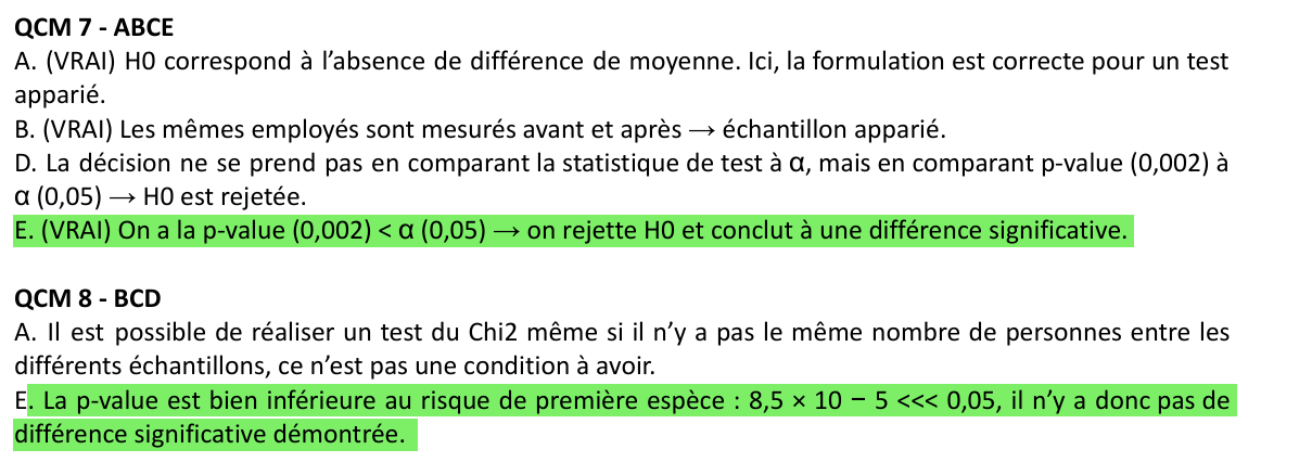 Ancien Responsable Matière OnNeGiflePasLeVent Posted December 6, 2025 Ancien Responsable Matière Posted December 6, 2025 Il y a 18 heures, adilramitochondrie a dit : Bonjour, sujet type 1 QCM 7 item D « D. Le degré de signification p est la probabilité d’obtenir dans la population une valeur au moins aussi extrême que la valeur observée dans l’échantillon si H0 est vraie. » Il me semblait que c’était la probabilité de trouver une valeur au moins aussi extrême dans un nouvel échantillon, car sous HO mu est forcément égale a mu 0. S’agit il d’une erreur de ma part ou de l’énnoncé? Merci d’avance par la réponse Bonne après-midi Bonjour ! Alors non ce n'est pas une errata ! La formulation est peut etre un peu confuse mais la définition reste la bonne : Le degré de signification p est la probabilité sous H0 d'obtenir une staristique de test au moins aussi extrême que celle observée dans l'échantillon. La bonne formulation sera plutot celle là mais celle de l'énoncé est également correct bien que très maladroite désolé pour ça... il y a une heure, alix.1 a dit : bonjour, je pense qu'il y a une petite erreur, la correction des items se contredisent. Merci Salut !! Alors je suis presque sure d'avoir déjà repondu à cette item mais je ne le retrouve pas donc bon... C'est en effet une errata quand pvalue < risque de premier espèce alpha alors on rejette H0 au risque alpha de se tromper. Donc ici l'item E est bien FAUX. jooo, alix.1 and emeline01 3 Quote