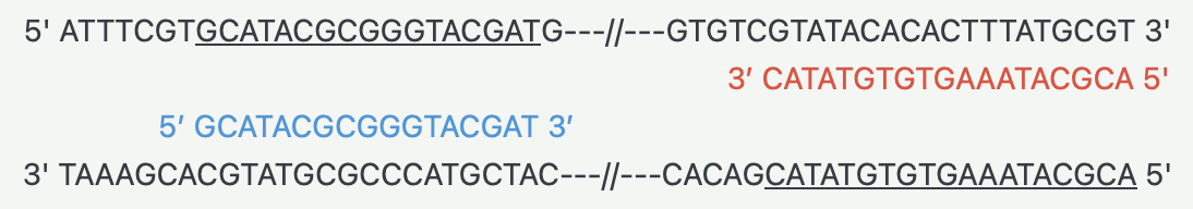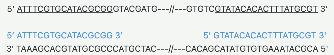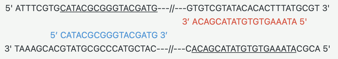 Marcophage Posted November 17 Posted November 17 (edited) Coucou, Je suppose que l'on t'a déjà expliqué la méthode, mais il s'agit ici de synthétiser à partir d'ADN qui est double brin, il te faut donc trouver une amorce pour le brin sens et une pour le non sens de chaque côté qui ont été représenté au début et à la fin du gène. Le tout en respectant la complémentarité des bases et du sens. 5'->3' 3'<-5' Laisse moi 5min que je finisse mon tit déj et je t'explique ton cas particulier. A. 5' ATTTCGTGCATACGCGGGTACGATG---//---GTGTCGTATACACACTTTATGCGT 3' 5' CATACGCGGGTACGATG 3' 3' ACAGCATATGTGTGAAATA 5' (retourné) 5' ATAAAGTGTGTATACGACA 3' (il faut le retourner) 3' TAAAGCACGTATGCGCCCATGCTAC----//----CACAGCATATGTGTGAAATACGCA 5' Ici, l'amorce 1 s'hybride au brin complémentaire et l'amorce 2 s'hybride au brin visible B. 5' ATTTCGTGCATACGCGGGTACGATG---//---GTGTCGTATACACACTTTATGCGT 3' 5' GCATACGCGGGTACGAT 3' 3' CATATGTGTGAAATACGCA 5' (retourné) 5' ACGCATAAAGTGTGTATAC 3' (pareil) 3' TAAAGCACGTATGCGCCCATGCTAC----//----CACAGCATATGTGTGAAATACGCA 5' Ici, c'est pareil C. 5' ATTTCGTGCATACGCGGGTACGATG---//---GTGTCGTATACACACTTTATGCGT 3' 5' ATTTCGTGCATACGCGG 3' 5' GTATACACACTTTATGCGT 3' 3' TAAAGCACGTATGCGCCCATGCTAC----//----CACAGCATATGTGTGAAATACGCA 5' Bref, j'espère que c'est plus clair comme ça Edited November 17 by Marcophage jujéjunum 1 Quote