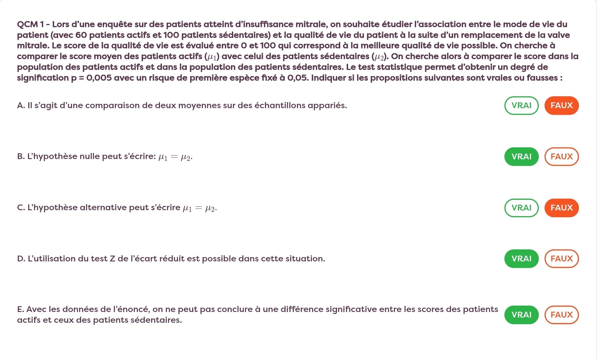 _lala_ Posted November 17 Posted November 17 Bonjour, Je ne comprends pas pourquoi l'item E est vrai, pour moi, on a une situation de 2 échantillons indépendants, donc j'utilise le test de student qui a dans ce cas a pour condition d'application l'égalité des variances. Dans la consigne on ne nous la donne pas, comment est-ce qu'on peut conclure à une différence significative ? Ça n'a aucun lien ? Merci beaucoup d'avance ! Quote