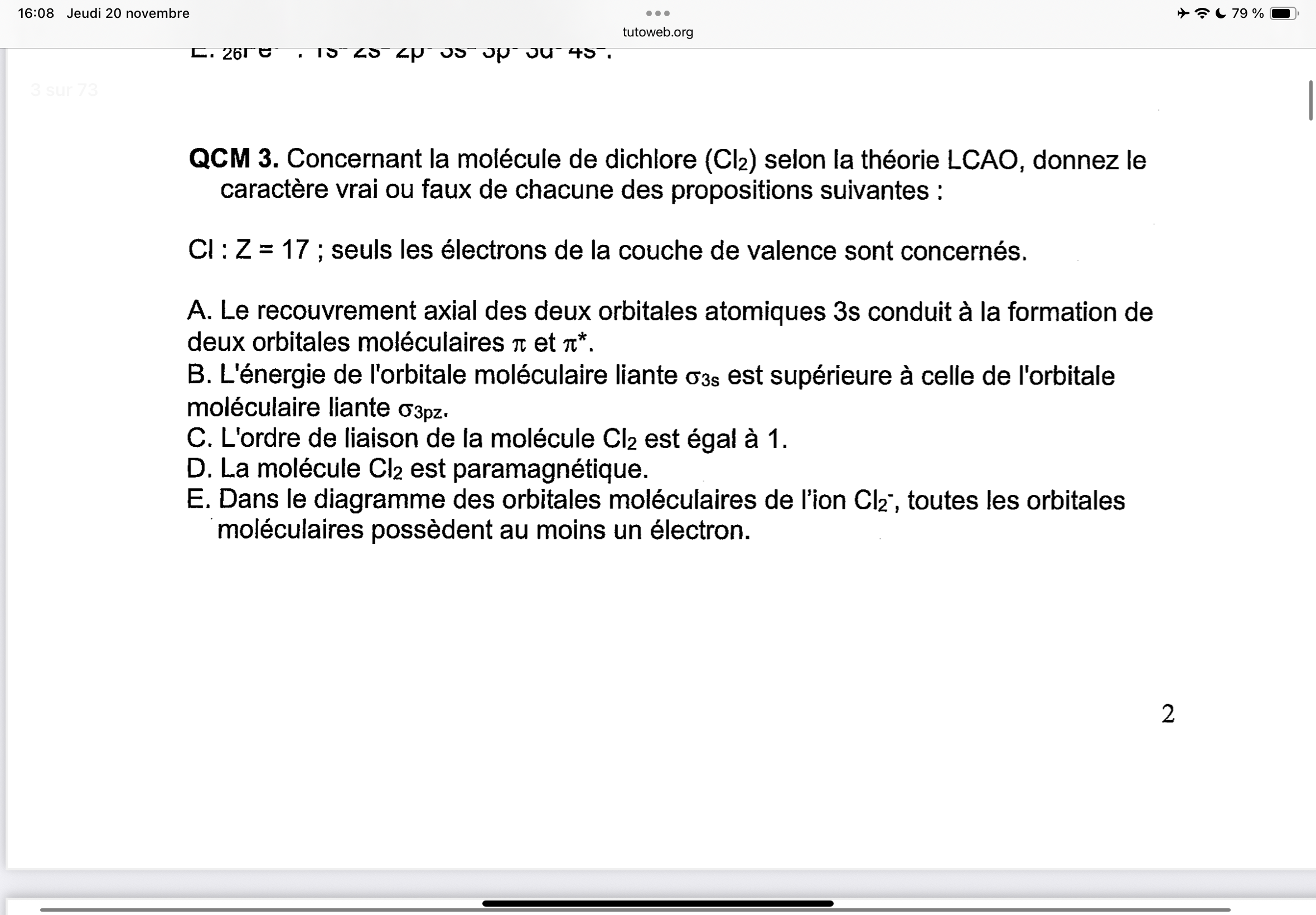 Ancien Responsable Matière Solution davidd Posted November 20 Ancien Responsable Matière Solution Posted November 20 Hey si on résumeles étapes: Etape 1 Écrire la configuration électronique de l’atome Cl Le numéro atomique du chlore : Z=17 donc la configuration électronique d’un atome de Cl:1s2 2s2 2p6 3s2 3p5. Etapes 2 repéré les électrons de valence qui sont donc : 3s² 3p⁵ Soit 7 électrons de valence par atome. 3) Placer les orbitales atomiques pour chaque atome Cl, tu mets : une orbitale 3s trois orbitales 3p : p x ,p y ,p z Ces orbitales vont ensuite se combiner et tu obtiens l'orbitale molecullaire au milieu . Tu remplis de bas en haut ( puis pour les pi tu remplis de gauche puis droite puis gauche puis droite etages par étages ) Voilaaaa tout courage pour la suite !!! quantitédematière and Ankyyrine 2 Quote