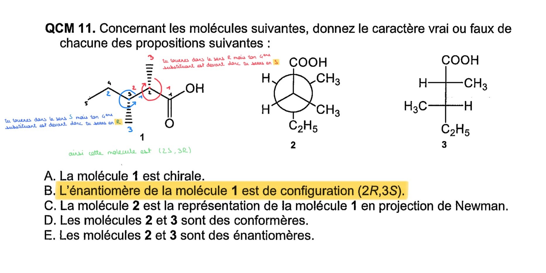 Tuteur Solution brocascouille Posted November 20 Tuteur Solution Posted November 20 Salut, En effet lorsque tu regardes la molécule 1 de cet énoncé tu te retrouves avec un molécule qui est (2S,3R). Mais attention, dans l’item B on te demande quelle est la configuration de l’éniantomère de la molécule 1 (donc son exact opposé). Si tu te réfères au schéma que je t’ai mis tu te retrouves donc bien avec l’éniantomère de la molécule 1 qui sera de configuration (2R,3S) ! J’espère que ça t’aide à mieux comprendre :) quantitédematière and Ankyyrine 2 Quote