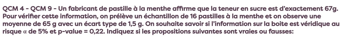 Responsable Matière Solution jooo Posted November 22 Responsable Matière Solution Posted November 22 Salut ! Effectivement ici la différence n'est pas significatif ici car : alpha < p-value (0,05<0,22). On ne rejette donc pas H0. C'est probablement une errata, est ce que tu peux signaler le QCM sur la plateforme pour qu'on puisse le corriger? Hélie, OnNeGiflePasLeVent, Nesss and 2 others 5 Quote