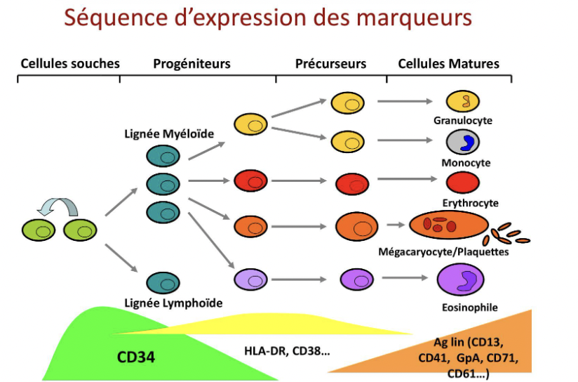 letartare06 Posted November 22 Author Posted November 22 il y a 7 minutes, marilordose a dit : Coucou @letartare06, C'est vrai que c'est pas forcément clair dans le cours. Comme dit dans l'item, les cellules souches hématopoiétiques exprime, à leur surface, la protéine membranaire CD34. Cependant c'est une protéine qui sert aux scientifiques puisqu'il s'agit d'un marqueur phénotypique. La CD34 varie selon le stade maturation et la lignée cellulaire (c'est ce qui nous interesse). Ainsi grâce à des anticorps monoclonaux fluorescents analysés en cytométrie en flux, on va pouvoir deviner de quel type cellulaire il s'agit. CD34 permet de savoir si les CSH vont faire parties ensuite de la lignée lymphoïde ou de la lignée myéloïde. Donc CD34 n'a pas d'influence la lignée cellulaire, mais la lignée cellulaire en a une sur CD34 puisque suivant la lignée le phenotype de CD34 change. Je te met un schéma qui m'avait aidé en espérant que tu comprennes mieux ! résumé : - CD34 sert à analyser et reconnaitre les différentes lignées - La lignée influence le phénotype de CD34 mais ce n'est pas réciproque Bonnes révisions :) Ah oui d'accord la je comprends mieux merciii bcp An-Schwann and marilordose 2 Quote