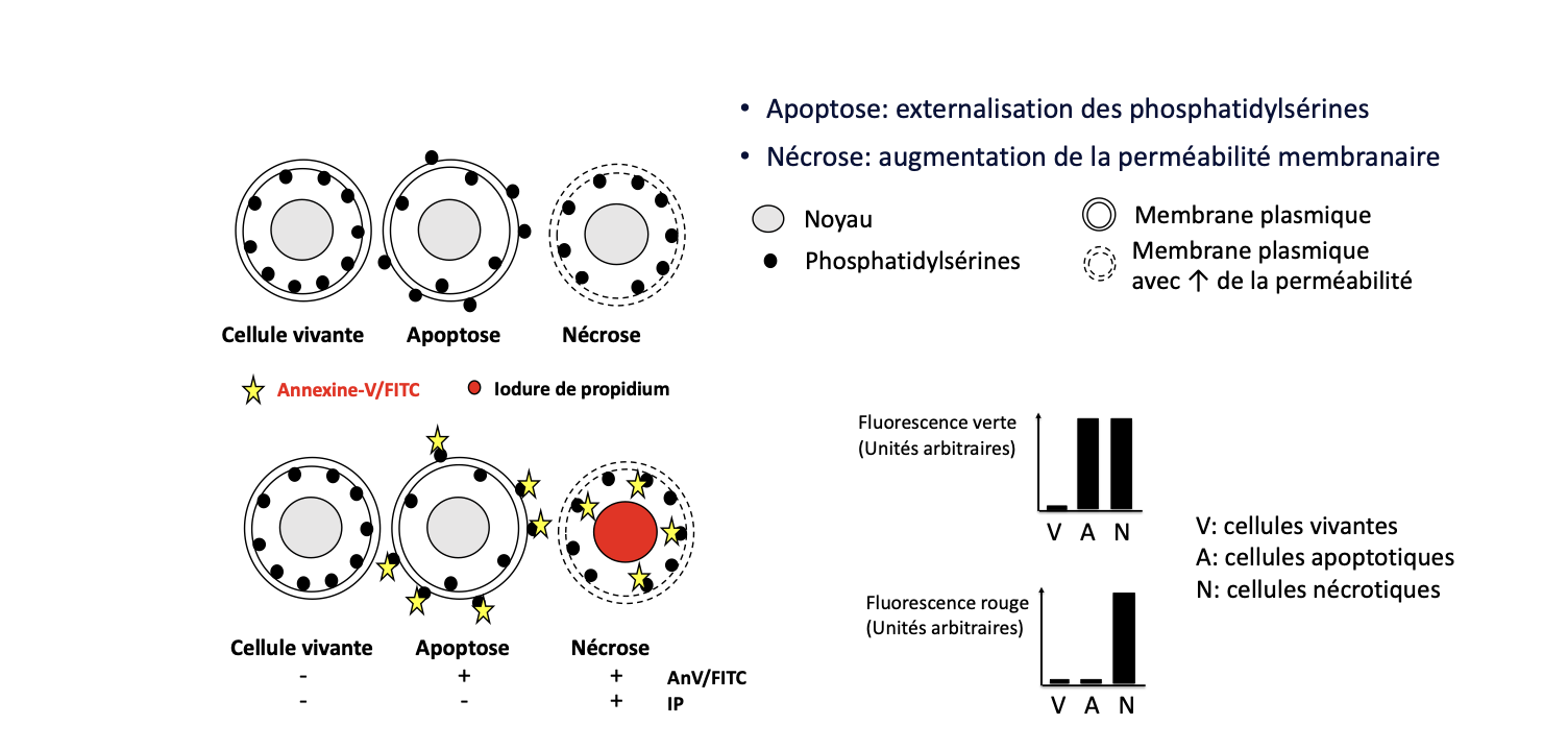 Solution zigoto Posted November 23 Solution Posted November 23 (edited) Salut Alors ici le QCM porte sur les différentes techniques de marquage d'une cellule lors de la mort cellulaire. Tu as deux types de marquages les marquages à l'Annexine V couplée au FITC et les marquage à l'iodure de propidium. Ce qu'il faut savoir c'est qu'une cellule en apoptose contrairement a une cellule vivante va présenter une externalisation de ses lipides (phosphatidylsérine) à ça surface, et une cellule nécrotique va subir une augmentation de ça perméabilité ce qui entraine que des substances peuvent y rentrer et donc notamment ton Annexine V et l'iodure de propidium. (Perso la nécrose je la visualise un peut comme un fromage avec pleins de trou je trouve ça plus simple a retenir bref) Du coup lorsque expérimentalement tu veux mettre en évidence ces altérations (apoptose/ nécrose) membranaire tu incube tes cellules avec de l'Annexine V couplé au FITC qui fluoresce en vert et avec de l'iodure de propidium qui fluoresce en rouge. Il faut savoir que l’annexine V est une protéine qui a une forte affinité pour les phosphatidylsérines. Elle peut donc se fixer sur les cellules apoptotiques (à leur surface, sur le feuillet externe de la membrane plasmique) vu qu'elles y présentent leurs phosphatidylserines et sur les cellules nécrotiques (à l’intérieur de la cellule) vu que la perméabilité est augmenté L’iodure de propidium est un agent intercalant de l’ADN qui ne rentre dans les cellules que lorsqu’elles présentent une augmentation de la perméabilité membranaire. Ainsi, dans ces conditions d’incubation, l’iodure de propidium ne marque que les cellules nécrotiques. Et après en analysant les résultat des coloration du obtiens ça Pour ton QCM j'aurais dis que C est vrai D est faux vu qu'elle n'est pas marquée à l'iodure de propidium E est vrai J'espere que mon explication est claire Edited November 23 by zigoto marilordose, An-Schwann and Nentiqu 2 1 Quote