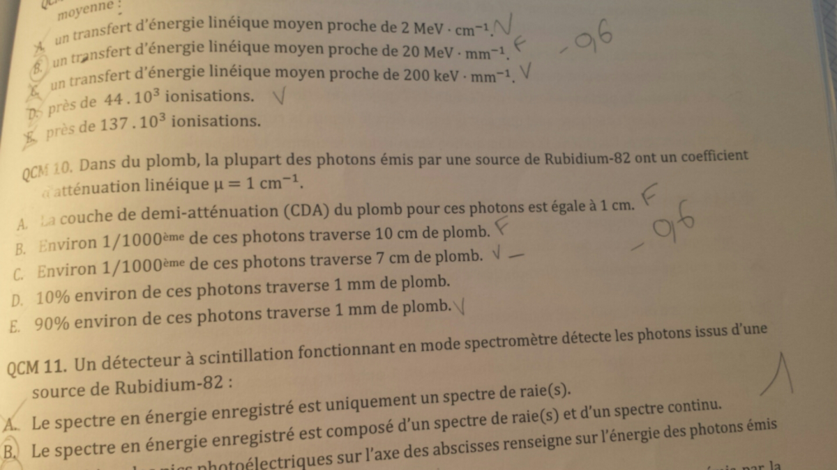 Mathilde3104 Posted December 19, 2016 Posted December 19, 2016 Dans le QCM mis en fichier joint je n'arrive pas à résoudre les items C et D en effet je trouve bien une CDA de 7mm soit 0.7cm. Mais je ne sais pas comment calculer le pourcentage de photons qui passent 1mm de plomb car ça ne fait même pas une CDA complète mais bien 1/7 de CDA! Du coup je n'arrive pas à calculer! Si qqun sait le faire ou à une technique particulière pour le faire je suis preneuse! Merci d'avance!