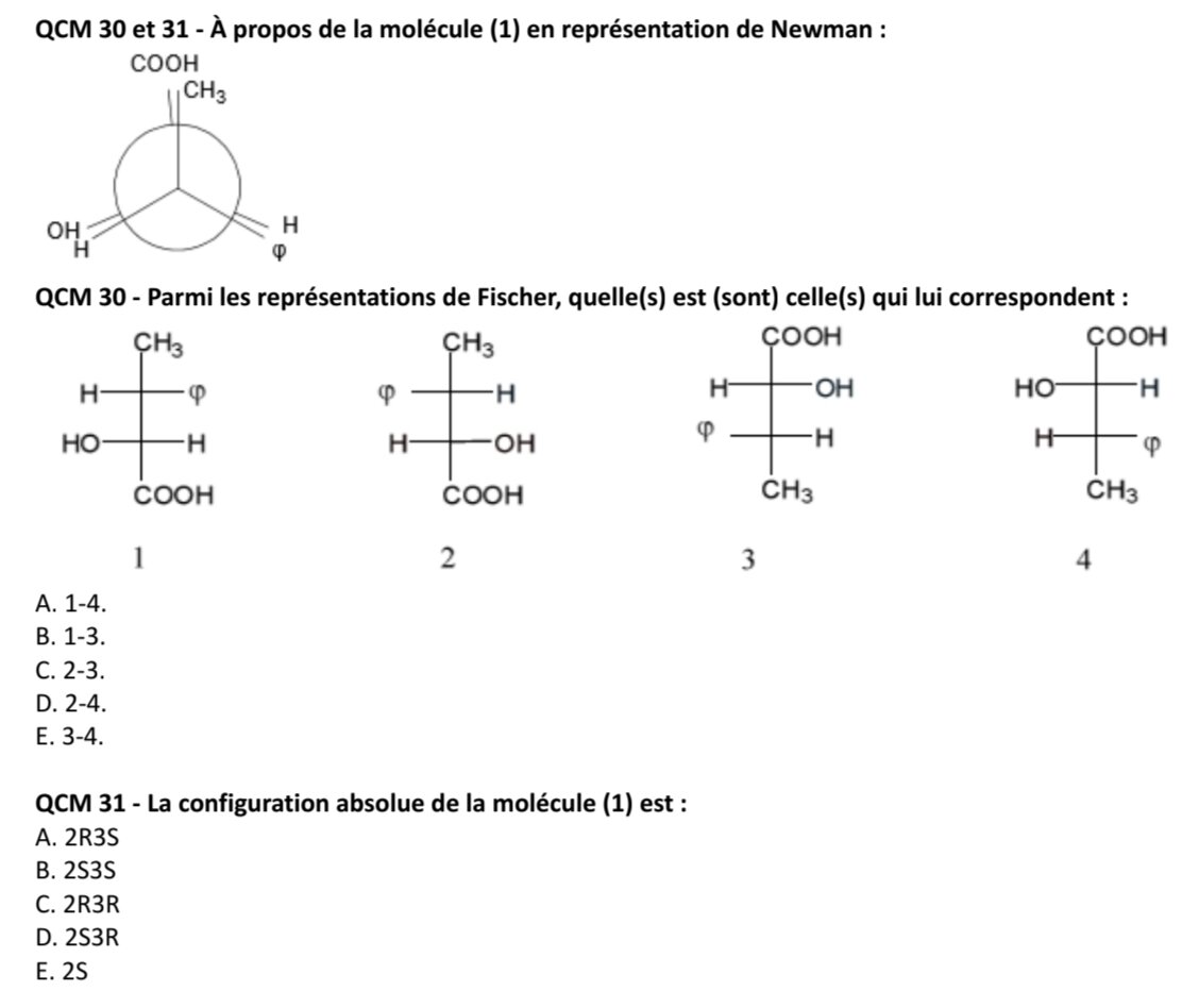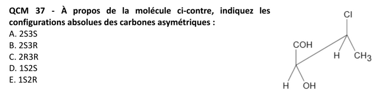 .loulou. Posted November 23 Posted November 23 (edited) Bonjour, j’ai fait plusieurs qcm sur la configuration R et S que j’ai trouvé dans le poly du tat sauf qu'il y en a plusieurs pour lesquels je ne comprend pas pourquoi j’ai faux même avec la correction. Ici j’ai mis la réponse C mais c’est la D qui est juste. Je ne comprend pas la configuration du carbone 3 Par rapport au qcm 31, j’ai mis la D et la E mais c’est la C La bonne réponse est la A alors que j’ai mis la B Ici j’ai mis la réponse E alors que c’est la C. Dans la correction il est dit que le carbone 1 est CHO mais comment peut on le savoir ? Pour chacun des qcm j’ai numéro dans l’ordre en respectant l’ordre de priorité I>br>cl... et des fois je ne comprends pas pourquoi un hydrogène passe avant un chlore. Voilà désolée si c’est un peu et merci d’avance aux personnes qui prendront le temps de répondre Edited November 23 by .loulou. Quote
