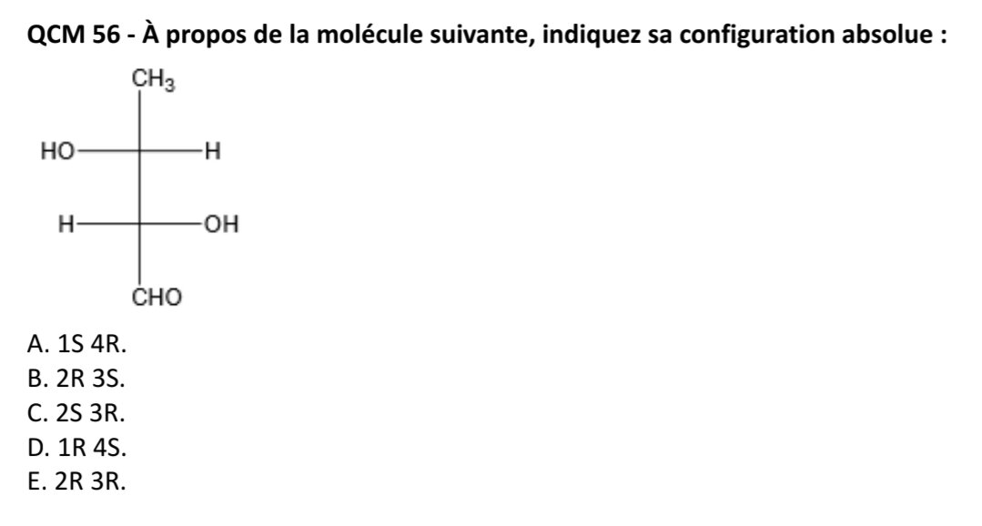 Tuteur Solution L'Electron_Augé Posted November 23 Tuteur Solution Posted November 23 Salut @.loulou., Je vais reprendre chaque figure en essayant de t'indiquer les éventuelles difficultés et pièges dans lesquels tu as pu tomber. Les erreurs d'inattention sont fréquentes en chimie orga (surtout quand on enchaine les QCM). On a bien le 2S 3R, attention à la perspective Pour la QCM 31 c'est bien le OH en 1 attention COOH est bien la fonction prioritaire en nomenclature mais si on la décortique on a d'abord la liaison à un C puis ce C est doublement lié à O et lié à OH alors que le OH on a directement la liaison au O (je ne te représente pas le C3 étant donné que tu as bien compris comment ca marche au vu de ta réponse) Pour celle là, voici la configuration mais je n'ai pas bien compris ce qui te posais problème pour le 3R (n'hésite pas si tu as besoin d'une explication) Enfin, pour ce qui est de de la nomenclature le Carbone numéroté 1 (début de ta chaine) est celui de la fonction aldéhyde CHO car on se réfère aux règles de nomenclature ici (ATTENTION différentes des règles pour déterminer la config R/S). Sinon pour la configuration du carbone 2, CHO est bien le groupement numéro 2 autour de ce carbone asymétrique. /!\ On est en Fisher avec le grp 4 à l'horizontal donc on inverse bien la configuration du sens dans lequel on tourne. J'espère avoir apporter les réponses à tes questions, n'hésite pas si ce n'est toujours pas clair, j'essaierais de détailler au mieux ce qui te pose toujours problème !! Bonne soirée Ankyyrine 1 Quote