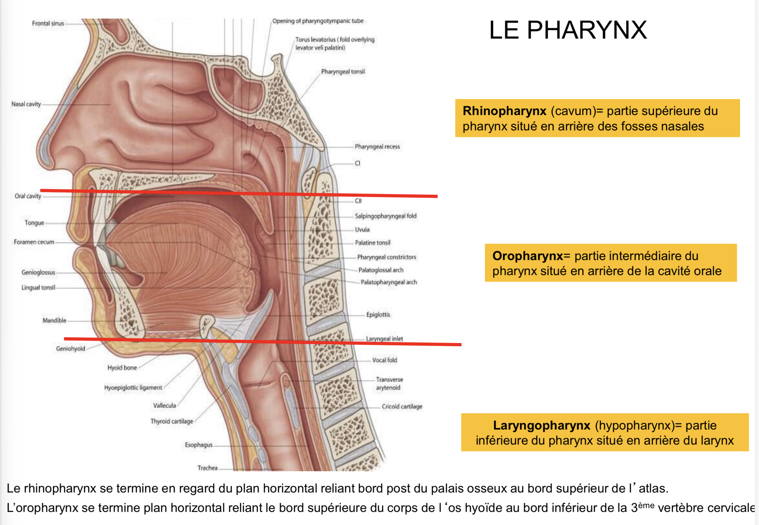 Bonjour, hier Mr de Bonnecaze a dit que la limite entre l'oropharynx et le laryngopharynx était le plan passant par le bord supérieur de l'os hyoide et le bord inférieur de C3 mais sur son schéma on dirait que c'est l'inverse ( le bord inf. de l'os hyoide et le bord sup de C3, du coup c'est une erreur de sa part j'imagine? Ou alors le diapo est vicieux?