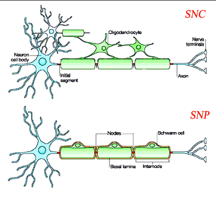 letartare06 Posted November 25 Author Posted November 25 il y a une heure, Momomo a dit : Coucou, alors ce qu’il faut comprendre c’est que le recouvrement de l’axone est discontinu. L’oligodendrocyte va enroulé l’axone mais pas entièrement, les zones couvertes se nomment internodes. Les espaces non couvertes par l’oligodendrocyte se nomment les noeuds de Ranvier, le courant électrique est conduit sur l’axone de noeud de ranvier en noeud de ranvier= conduction saltatoire. Est ce plus claire? Je peux réexpliquer si besoin. il y a 13 minutes, Tristandinite a dit : Coucou @letartare06 ! J'ajoute à l'explication de @Momomo ce petit schéma : Tu peux voir les espaces ("nodes") entre les différents rouleaux de myéline. Imagine que le courant saute de nœud de Ranvier en nœud de Ranvier (la fameuse conduction saltatoire), ce qui fait que la conduction nerveuse, quand l'axone est myélinisé, est super rapide ( au max 100m.s quand même, ça fait du 360km/h c'est assez balèze). C'est pourquoi lorsqu'un crabe te pince le doigt, tu hurles d'emblée, et pas le soir en rentrant à la maison : l'information est quasi instantanée J'espère qu'avec tout ça c'est ok pour le noeud de ranvier Bonne fin de journée Ka-Chow Merciii bcp à vous c'est très claire Tristandinite 1 Quote