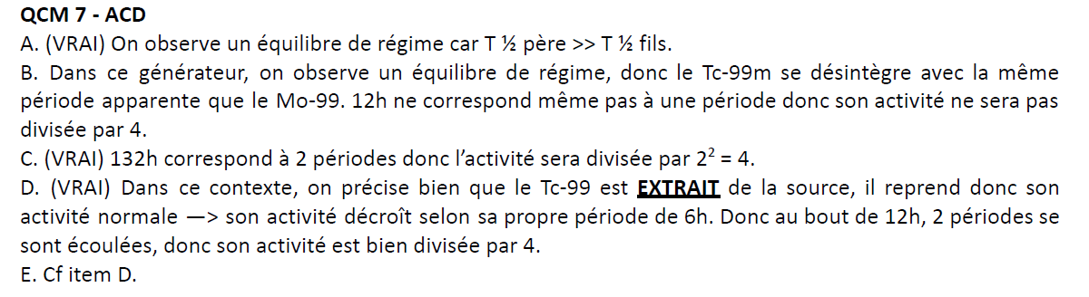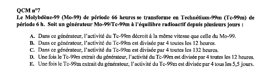 Rif-Power Posted November 25 Posted November 25 Bonjour, je ne comprends pas du tout ce qcm ni sa correction. On a générateur avec 2 noyaux: le Mo-99 de période 66h (c'est le temps qu'il lui faut pour se transformer en un autre noyaux?) et le Tc-99 de période 6h. Item A: Dans la correction, on nous dit qu'il y a un équilibre de régime car la la moitié de la période du père est supérieur à la moitié de la période du fils , 33>3 et ça c'est un équilibre de régime ? Item B/C/D/E: Je ne comprends pas le raisonnement, si quelqu'un peut bien m'expliquer. J'ai juste compris que quand on sort un noyaux du générateur il garde son activité normal. Merci d'avance Dr_Zaius 1 Quote