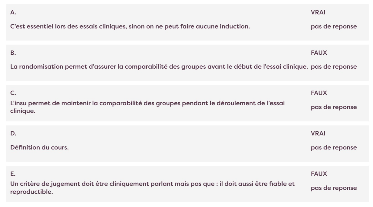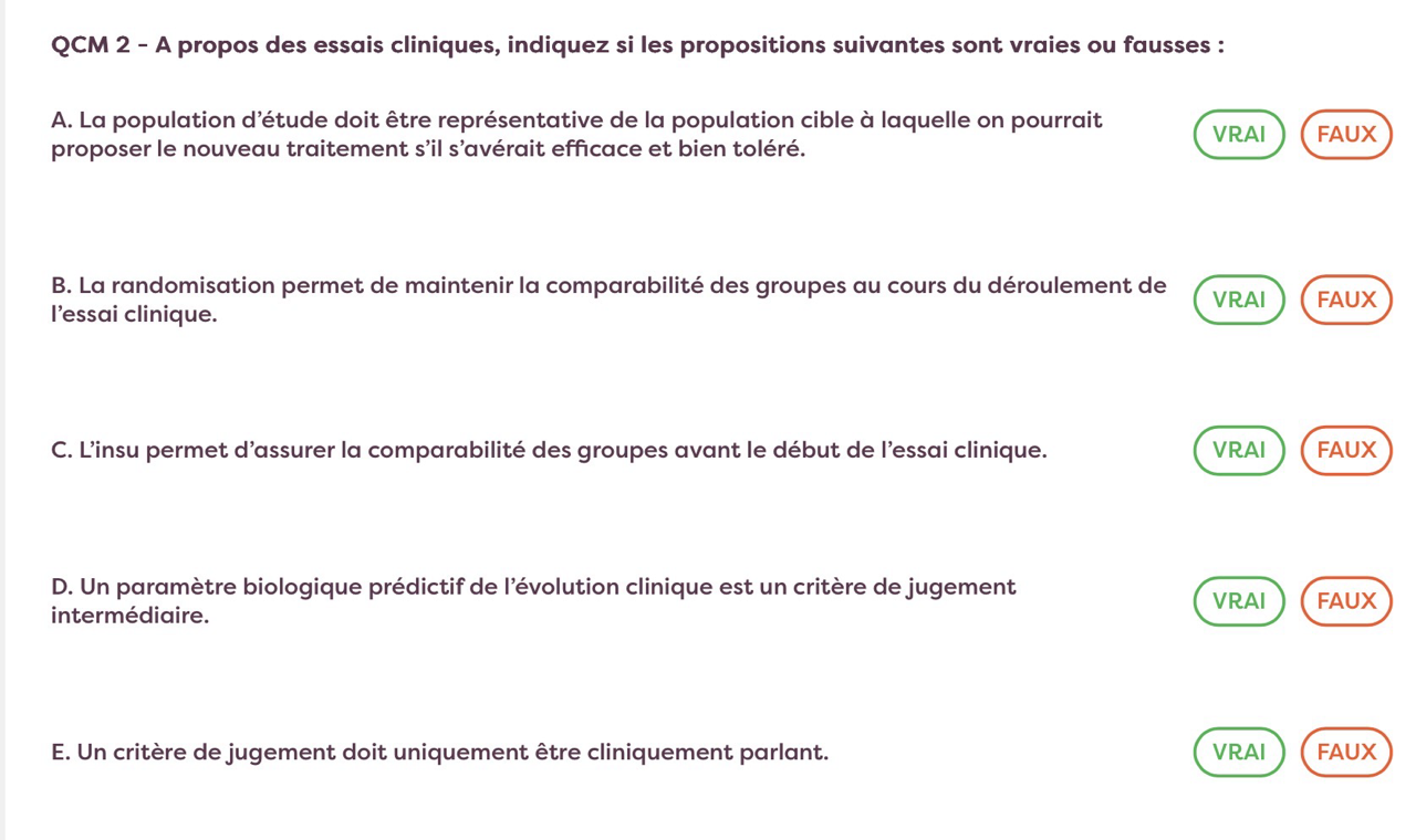 Tuteur Solution Adelta_apical Posted Sunday at 02:48 PM Tuteur Solution Posted Sunday at 02:48 PM Salut! Cette notion tombe assez rarement en QCM mais il est mieux de bien la comprendre! Le critère clinique est un critère qui va refléter directement l’état de santé du patient (ou dis plus vulgairement son “bien être”), ça peut être la douleur qu’il ressent, la mortalité, la guérison, les complications… Le critère composite est un peu plus complexe, il regroupe plusieurs critères d’observation qui peuvent être indépendants en un seul. Par exemple, un critère composite peut contenir un arrêt cardiaque, un AVC, un infarctus du myocarde… Le critère intermédiaire quant à lui est un critère qui mesure un paramètre biologique sensé prédire l’évolution clinique du patient. Par exemple le taux de cholestérol, la tension… c’est ce qui est sensé expliquer l’état de santé du patient en quelques sortes. Je n’ai pas vu beaucoup de QCM qui parlent de cette notion mais je peux essayer de te donner un exemple. Courage à toi ! jooo, Hélie, OnNeGiflePasLeVent and 2 others 5 Quote