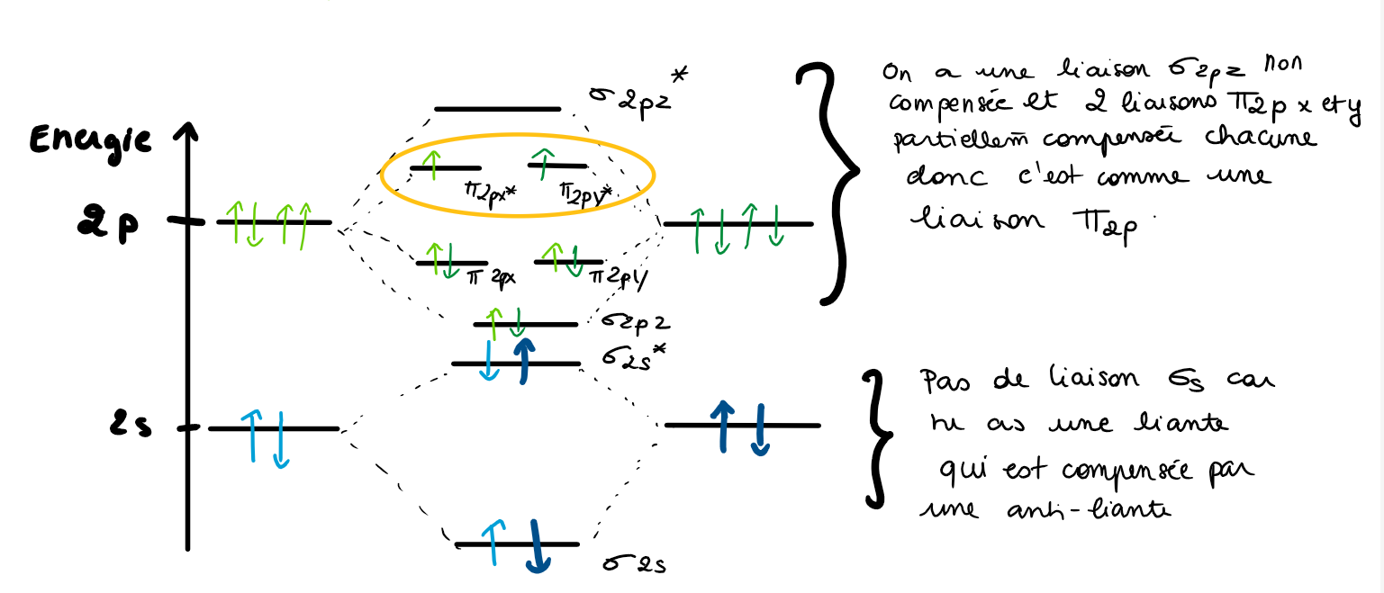 Tuteur ArthurD Posted Sunday at 07:20 AM Tuteur Posted Sunday at 07:20 AM Salut ! je vais essayer de compléter la réponse de @Aleksandra en t’expliquant avec mes mots à quoi correspondent les orbitales. Deux atomes interagissent par l’intermédiaire de leurs atomes de couche externe ( valence ) ici il s’agit des électrons 2s ( qui en contient 2 ) et 2p ( qui en contient 4 ) pour former tes orbitales moléculaires. Par ailleurs à chaque interaction entre 2 orbitales atomique va engendrer une orbitale liante ( basse en énergie ) et une anti liante ( haute en énergie ). Son caractère pi ou sigma va lui dépendre de si ces orbitales atomiques se recouvrent en axiale (sigma) ou en latéral (pi) ( Il me semble qu’il y a un schéma pas mal dans ton cours sur les liaisons ). Pour répondre donc à ta question tes deux orbitales 2px et 2py ( liantes et anti liantes ) correspondent au recouvrement latéral des orbitales atomique 2px et 2py entre chaque atome d’oxygène ! J’espère que ce sera plus clair c’est pas évident à expliquer sans rentrer trop dans les détails n’hésite pas si tu as d’autres questions ! MJcmoi, Aleksandra and Ankyyrine 1 2 Quote