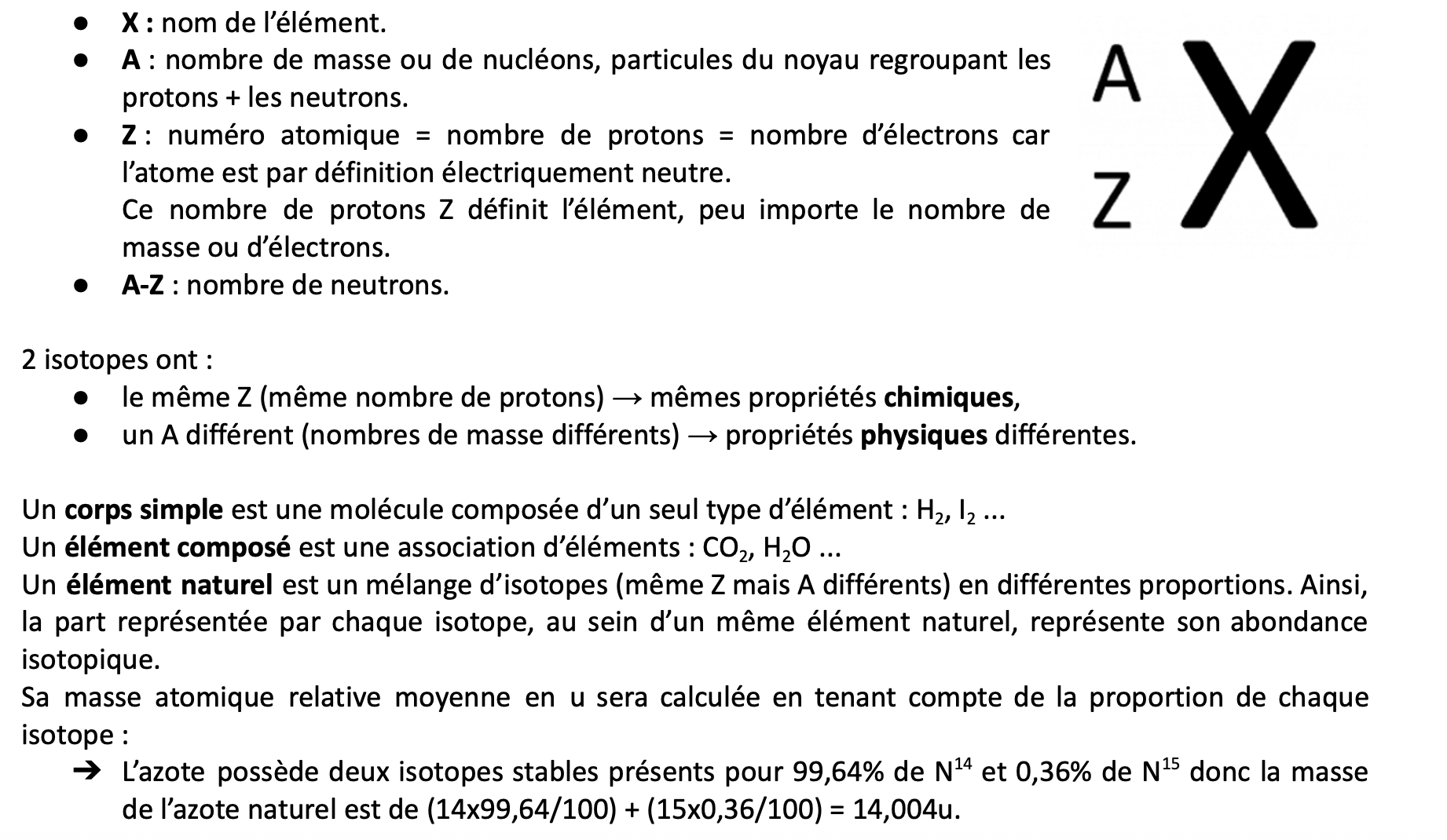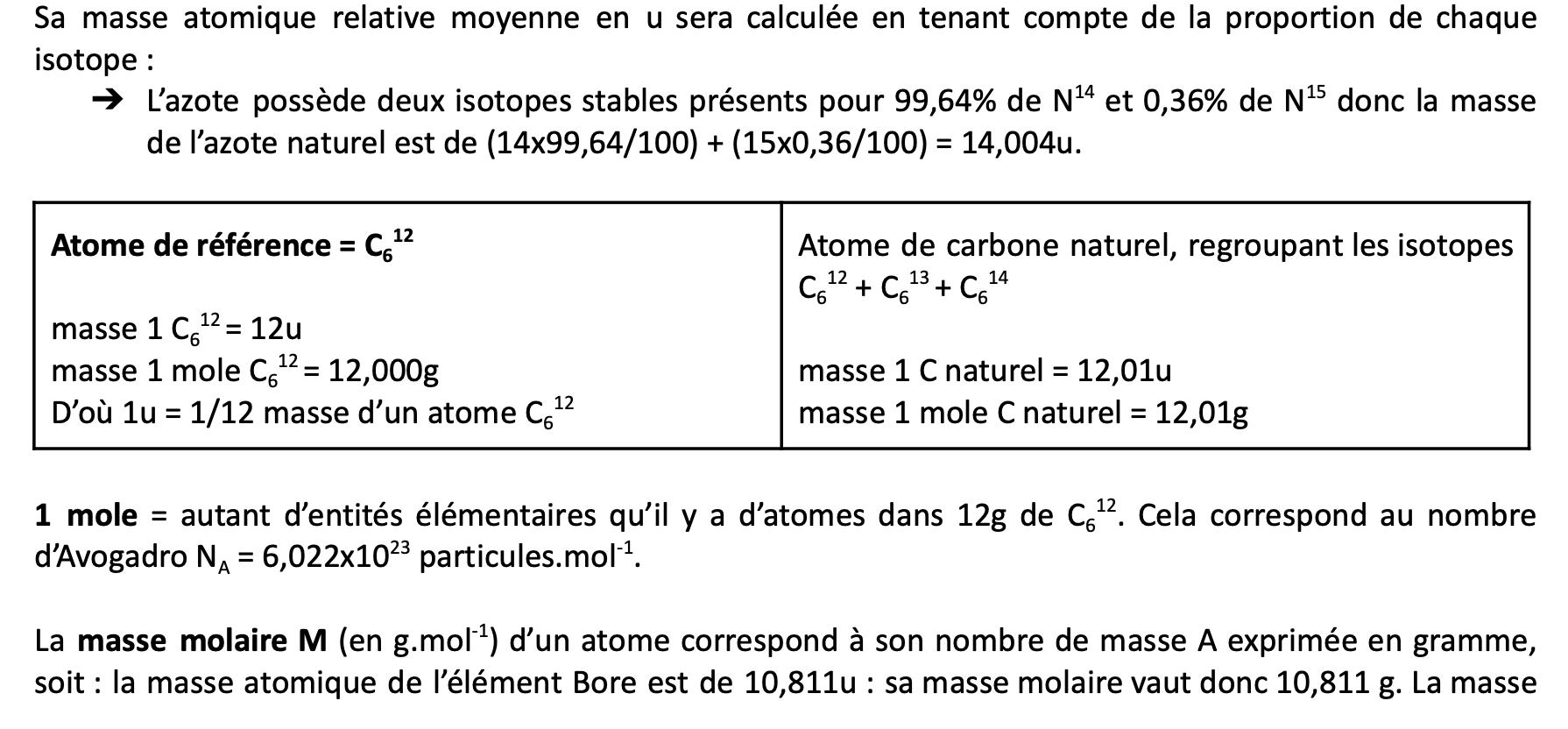 Tuteur Solution ArthurD Posted Monday at 08:13 AM Tuteur Solution Posted Monday at 08:13 AM Salut ! pour répondre à ce QCM tu dois te servir de cette partie du cour ( poly du TAT UE1 Chimie page 5 ) : Une fois que tu as ça tu sais que la masse molaire du 188O est d'environ 18 g.mol-1 ( car sa masse atomique est d'environ 18u ) ce que tu vas diviser par le nombre d'avogadro pour trouver un résultat en g (item A) Pour ce qui est des autres items ils sont moins compliqués et purement de type cours il faut simplement retenir ce que sont des isotope et bien se souvenir de la forme AZX avec A = nombre de masse = nombre de nucléons = neutrons + protons, Z = protons et aussi du fait que la masse d'un neutron est environ égale à celle d'un proton. J'espère que ca t'aura aidé n'hésite pas si tu as d'autres questions ! Ankyyrine, Bastitine, caro.tide and 1 other 3 1 Quote