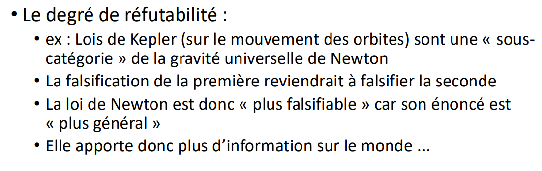 Responsable Matière Solution juliettebedel Posted Monday at 05:23 PM Responsable Matière Solution Posted Monday at 05:23 PM Comme la diapo du prof ne l’explique pas très clairement : plus une théorie est générale, plus elle peut être contredite, parce qu’elle s’applique à beaucoup plus de situations. Ce que montre l’exemple des lois, c’est que les lois de Kepler ne décrivent que le mouvement des planètes autour du Soleil, alors que la gravitation de Newton s’applique à tout l’univers. Du coup, il est plus facile de trouver un phénomène qui contredirait Newton (puisqu’on peut tester sa théorie partout), alors que Kepler ne peut être testé que sur les orbites planétaires, donc avec beaucoup moins de cas possibles pour la “falsifier”. Ainsi, une théorie plus universelle est logiquement plus falsifiable. Sanchez and lucasdlng 2 Quote