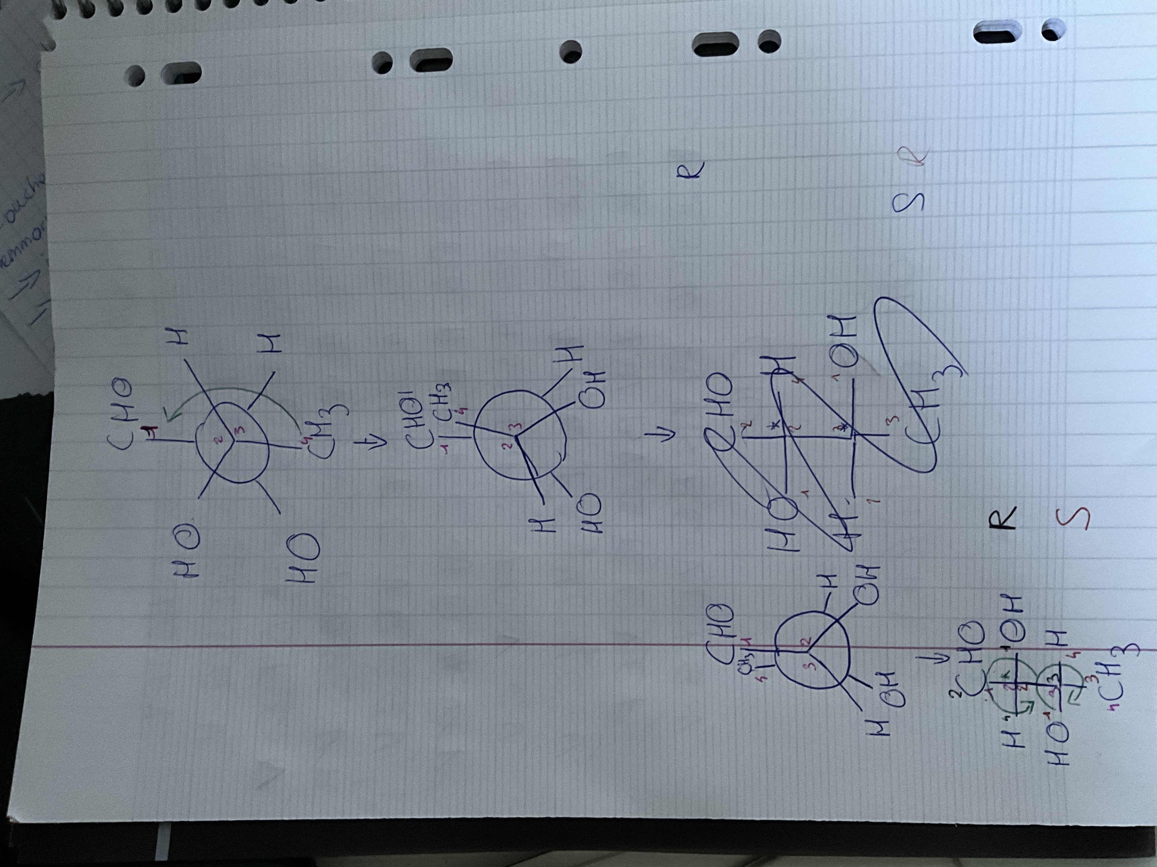 nimo Posted Tuesday at 08:54 AM Author Posted Tuesday at 08:54 AM il y a 16 minutes, POMME a dit : J’avoue j’ai pas spécialement l’habitude de passée en Fischer parce que je trouve ça beaucoup plus simple de visualiser la molécule en Newman mais je dirais que ça donnerais ça (fait pas gaffe à ce qui est rayé je savais plus si on devais mettre le carbone du haut devant mais j’en déduis que oui car sinon c’est inversé) : (Désolée l’image est à l’envers). numéroté en rose tu as la chaîne carboné, en noir l’ordre de priorité pour le premier carbone asymétrique et en rouge pour le deuxième carbone asymétrique. En vert les sens de rotation (je l’ai pas noter mais comme les H sont sur les coté en Fischer ils sont devant donc j’ai directement noter l’inverse). AU début tu doit passer en Newman eclipsé avec ta chaîne carboné en haut. Ensuite j’ai inversé la molécule pour avoir le carbone le plus oxydé devant. Enfin on déplie la molécule en laissant le plus oxydé en haut. Il ne reste plus qu’à faire la configuration, pour le numéro 2 ça tourne en sensé anti-horaire mais le H est devant donc il est R. Pour le carbone numéro 3 ça tourne en sens horaire mais le H est devant donc il est S. On a donc une configuration 2R3S. MERCI ENORMEMENT APRES 2 SEMAINES JE PENSES ENFIN AVOIR COMPRIS MERCIIIIII M il y a 16 minutes, aga_prch a dit : Oui, pardon je suis allé trop vite le deuxième carbone est bien R. H est bien derrière. MERCIII parce que ca m'a permis de voir aussi ou est ce que je pourrai eventuellement me tromper haha mercii à vous deuuux et bonne journée Bastitine, Ankyyrine and POMME 2 1 Quote