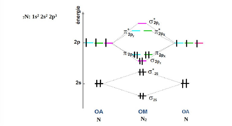 Tuteur Solution Ornithorynque Posted Tuesday at 02:31 PM Tuteur Solution Posted Tuesday at 02:31 PM Coucou Dans la molécule de N2 chaque atome est triplement lié et possède un doublet non liant. Quand tu as 3 liaisons, tu dois savoir que 2 sont des liaisons π et qu'une est une liaison σ. Personnellement je retenais que : -S'il y a une liaison alors c'est σ -S'il y en a 2 alors une est σ et l'autre est π -S'il y en a 3 alors c'est 2π et 1σ Je pense que c'est plus simple d'apprendre par cœur Si jamais tu veux utiliser le diagramme je te renvoie vers une autre publication qui t'explique bien Bastitine, Ankyyrine, quantitédematière and 1 other 3 1 Quote