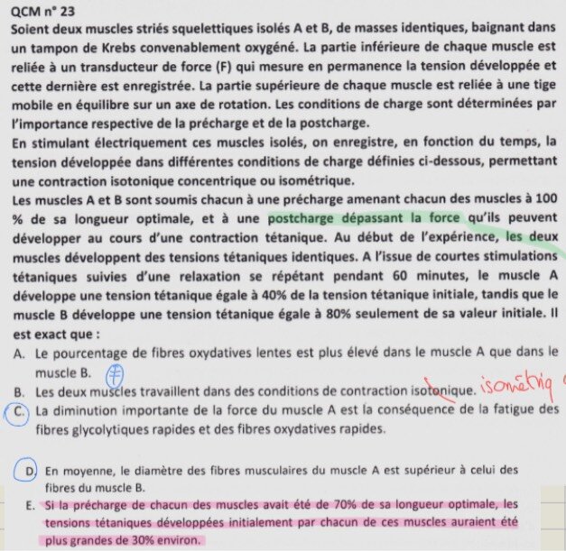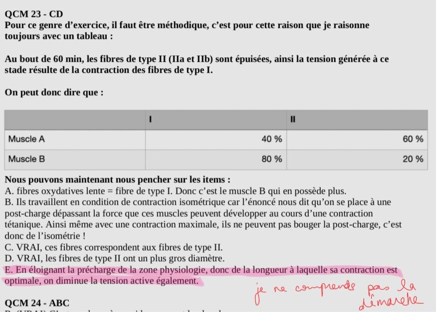 Rim_03 Posted Wednesday at 07:12 AM Posted Wednesday at 07:12 AM Salut! je suis entrain de faire des annales en physio concernant le muscle et je n'arrive pas a comprendre comment faire pour résoudre l'item E (que j'ai surligné en rose dans le sujet et la correction) même en lisant la correction. Est ce que qlq pourrait m'expliquer svp ? merci d'avance ! Quote