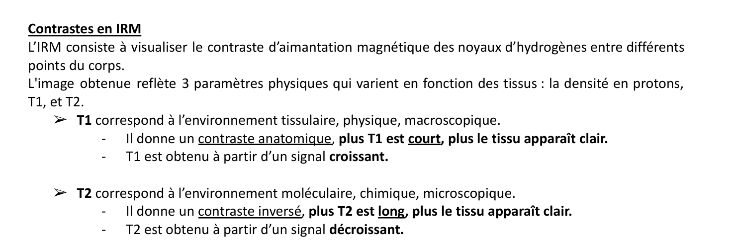 nooradrénaline Posted Wednesday at 08:52 AM Posted Wednesday at 08:52 AM (edited) Coucouuuu Alors il faut comparer les T1 et T2 des différents tissus. Là à l'occurrence ça donne T1A>T1B et T2A>T2B. Jusque là rien de bien compliqué. Maintenant pour savoir lequel apparaît plus clair, il faut savoir comment est pondérée ton image. Si c'est en T1, alors le tissus présentant la T1 la plus basse apparaîtra en plus blanc et "plus clair". Par contre, si on pondère à T2, c'est celui présentant la T2 la plus élevée qui sera plus clair. Pour tes items ça donne: A-400<800 =>T1B<T2B, donc B plus clair, la proposition vraie B-200>70 => T2A>T2B, donc A plus clair, la proposition est fausse J'espère t'avoir aidé, hésite pas si jamais c'est toujours pas clair sans mauvais jeu de mot Et surtout, bon courage! Edited Wednesday at 08:55 AM by n____ Lolordose and Cotytylédon 2 Quote