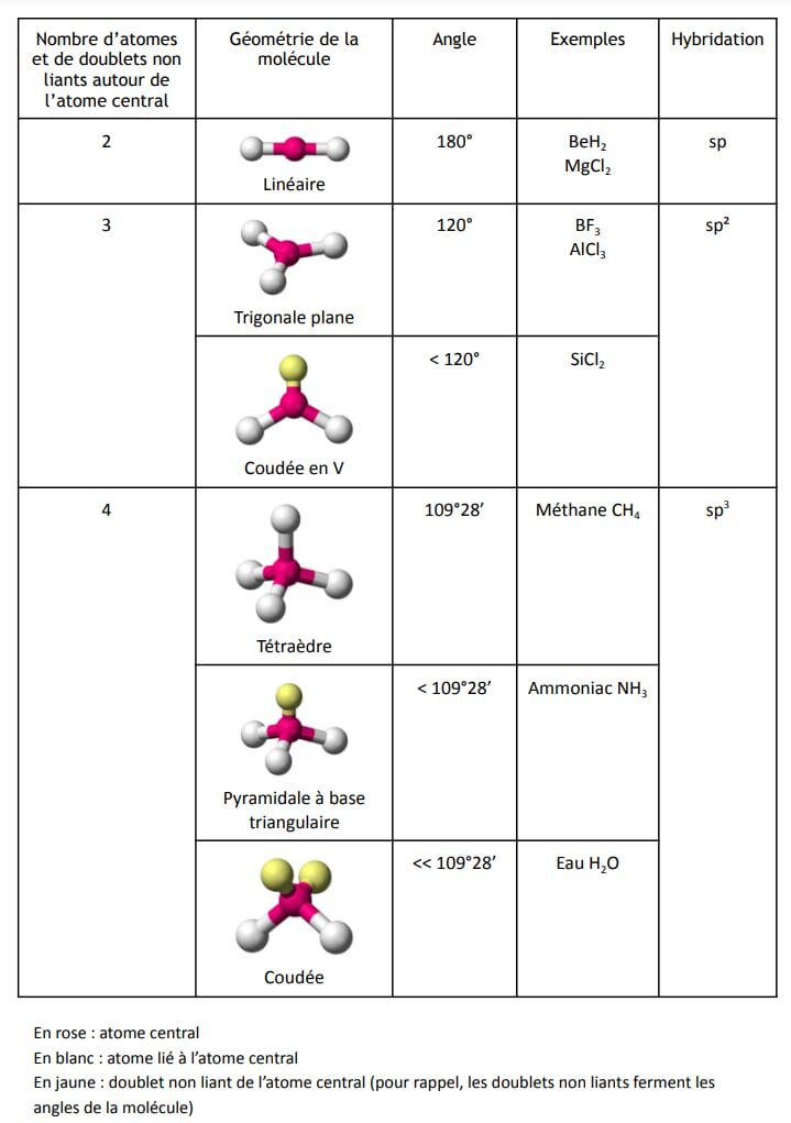 Tuteur Solution mitarachondrie Posted Wednesday at 07:50 PM Tuteur Solution Posted Wednesday at 07:50 PM coucouu ! En fait, les deux termes « coudé » et « coudé en V » décrivent des géométries similaires mais provenant d’hybridations différentes, ce qui explique la confusion. Lorsqu’un atome central est sp³ (4 zones électroniques, comme l’oxygène dans CH₃–O–CH₃ ou l’eau), sa géométrie électronique est tétraédrique ; mais s’il possède 2 doublets non liants, les doublets repoussent fortement les liaisons et la forme observée devient coudée en V, avec un angle nettement inférieur à 109°28 (≈104° pour H₂O). À l’inverse, lorsqu’un atome est sp² (3 zones électroniques), la géométrie électronique est trigonale plane, et si un doublet non liant est présent, la forme devient aussi « coudée » mais dans un plan, avec un angle proche de 120°, simplement un peu diminué par le doublet. Le tableau montre bien que le coudé sp³ (H₂O) est 3D et très fermé, alors que le coudé sp² (comme SiCl₂ dans l’exemple) est plan et plus ouvert. Ainsi, les deux sont « coudés », mais leur origine géométrique et leurs angles sont différents : sp² = coudé plan ~120° ; sp³ = coudé en V très fermé ~104° Ankyyrine 1 Quote