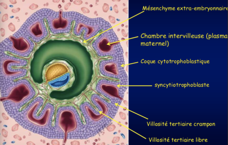 Tuteur Solution Amandineee Posted yesterday at 11:02 AM Tuteur Solution Posted yesterday at 11:02 AM Coucou alors je vais essayer de répondre le plus clairement possible à toutes tes questions. Pour le premier item : En effet, les cellules du cytotrophoblaste disparaissent petit à petit, pour amincir cette barrière placenta et pour pouvoir faciliter les échanges entre le sang maternel et le sang foetal. Donc l'oxygène, les nutriments, les déchets... passent de plus en plus facilement au cours du développement du foetus. Pour moi il n'y a pas d'augmentation de cette barrière placentaire. Deuxième items: Ici il faut que tu comprenne que les villosités placentaires viennent du foetus, c'est des petits capillaires du trophoblaste. C'est grâce à ces villosités placentaires que les échanges entre le foetus et la mère se font. Car ces villosités résident / baignent dans le sang maternel que l'on appel la fameuse chambre intervilleuse. Troisième items: Oui le sang maternel et foetal ne sont jamais en contact direct. Ce qu'il faut que tu retienne c'est que dans les villosités tertiaires il y a des petits capillaires qui viennent du foetus). C'est capillaires sont protégés par la barrière placentaire mais qui est quand même perméable pour les échanges donc entre la mère et le foetus. (regarde le schéma que je t'ai mis il peut peut-être t'aider). Quatrième items: En effet c'est un peu complexe à comprendre. Je vais essayer de te l'expliquer au mieux. Pour reprendre, l'intestin embryonnaire est divisé en trois : Antérieur, moyen et postérieur. L'intestin postérieur donne en effet le cloaque. Et l'intestin moyen donne l'anse vitelline. Je suis donc d'accord avec toi que l'item est porte à confusion, il se peut que se soit une errata. J'espère qu'avec toute ces explication c'est un petit peu plus clair ! Bon courage pour la suite des révisions. bibo 1 Quote