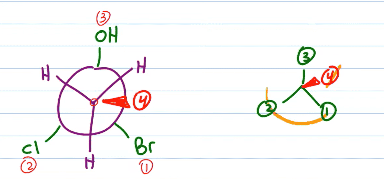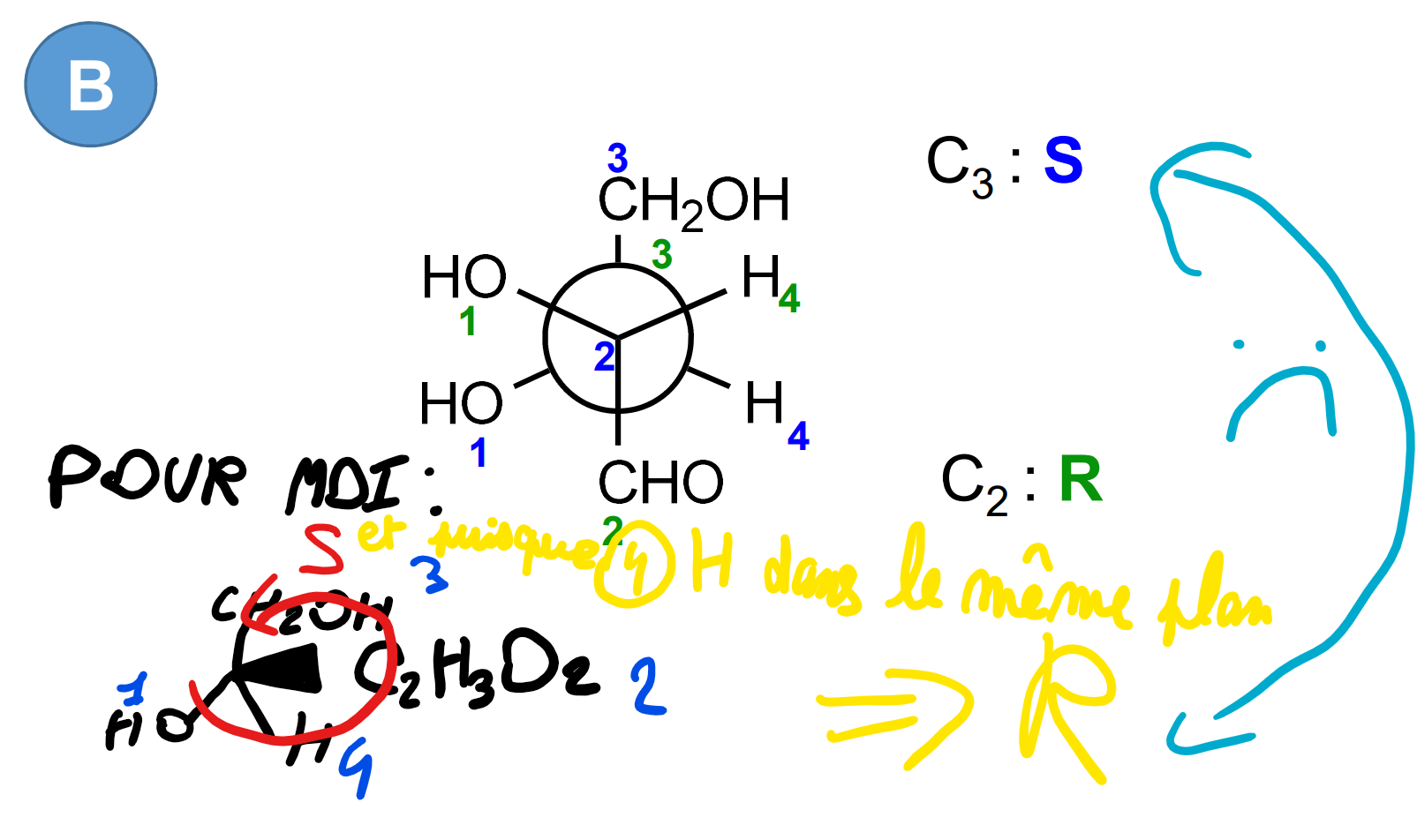 Solution Morpheus531 Posted 22 hours ago Solution Posted 22 hours ago (edited) Hey ! dans ce genre de cas il faut veiller à bien mettre en évidence les positions devant et derrière. ici tu n'as montré que le substituant qui est devant, il faut bien montrer le substituant qui est derrière. Si ça t'aide davantage, il vaut mieux dessiner toute la molécule pour bien savoir qui est dans le plan et qui ne l'est pas. voici un ptit dessin: https://ibb.co/wrJnFrPD Ici tu vois bien que le H est devant. Si tu as du mal à visualiser avec newman, je l'ai expliqué il y a pas longtemps sur un autre post: et d'ailleurs le C2H3O2 n'est pas devant ! seulement un des H du C2H3O2 l'est (cf dessin) bon courage !! Edited 22 hours ago by Morpheus531 Ankyyrine 1 Quote