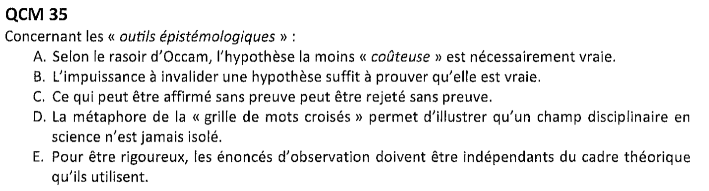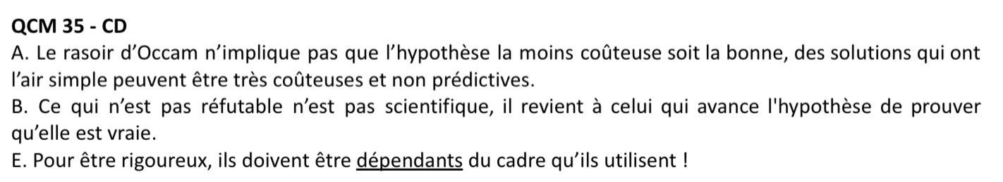 Tuteur Inesuline Posted 5 hours ago Tuteur Posted 5 hours ago Salut ! Effectivement, le fait que l'observation soit dépendante de la théorie est un problème de l'induction. Cependant, il serait difficile de s'affranchir totalement de la théorie pour formuler une hypothèse. En effet, pour évoluer en sciences, il faut des connaissance théoriques qui permettent ensuite de faire de la recherche. Bien que les connaissances théoriques puissent être fausses il faut se baser sur ces dernières pour chercher. Aussi, lorsque on propose un énoncé d'observation, il doit toujours s'intégrer dans un cadre théorique (cela permet de voir sur quels présupposés théoriques on s'appuie). Le QCM, fait référence aux "outils épistémologiques", la théorie de Susan Haack "Somme des savoirs et mots croisés" en fait parti. Dans le cadre de cette théorie, on voit bien (phrase surlignée) que pour faire de la recherche il faut avoir des connaissance approfondies sur notre domaine de recherche (c'est un cadre théorique). En espérant t'avoir aidé, Bon courage !! Sadlv and Elalastique 2 Quote