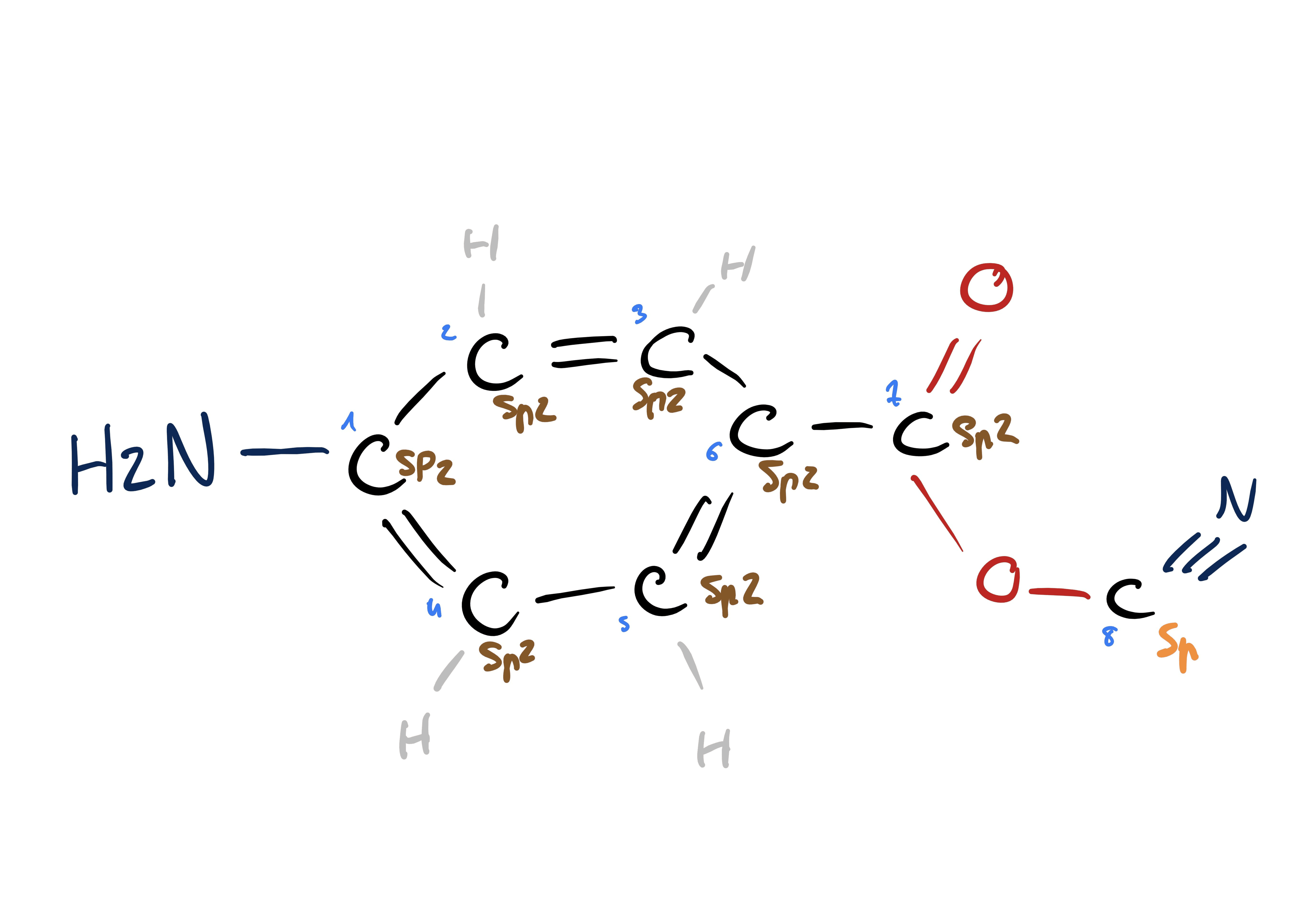 Marcophage Posted December 7, 2025 Posted December 7, 2025 Coucou, sans trop élaborer: Sur un carbone, 3 liaisons dont une est double ça fait 3σ et 1π, donc sp2. Ici, tu as un cycle à 6 carbones donc un cyclo-hexyl, sauf qu'avec les trois insaturations (le maximum possible), ça devient un phényl (avec NH2 ça fait une aniline...). Mais ça c'est pas nécessaire pour répondre, il faut juste voir que chaque carbone a 3 liaisons dont une saturé, donc sp2. Le cycle seul, ça fait 6 carbones sp2 + 1 (-CO-) sp2 = 7 carbones sp2. Peut-être, n'as-tu pas considéré les hydrogènes qui n'aparraissent pas sur la représentation semi-développée ? ça peut valoir le coup de les dessiner si tu ne les voit pas. Bonnes révisions jant 1 Quote