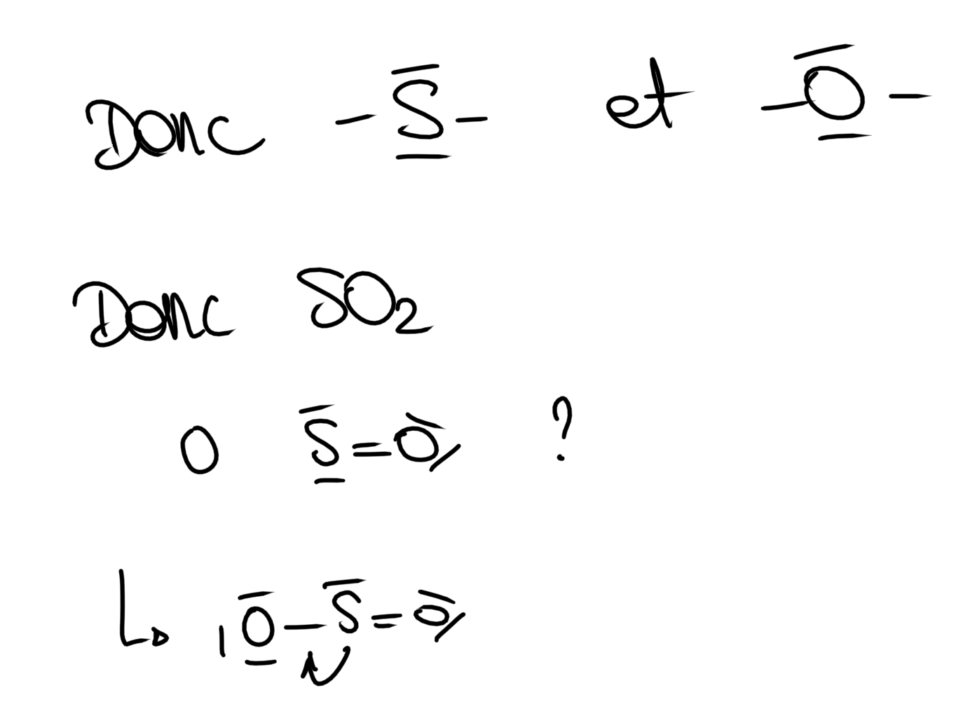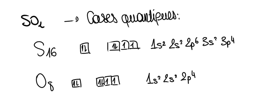 perseya Posted Monday at 03:09 PM Author Posted Monday at 03:09 PM 5 minutes ago, Lauraaaa said: Coucou !! Alors pour mieux comprendre je te propose d’analyser ensemble la molécule SO2. Donc la molécule de SO2 c’est très bien de commencer par les cases quantiques. De ces cases quantiques on détermine les liaisons que peuvent faire nos atomes. Dans le cas de la molècule de SO2 c’est un cas particulier, le S ne peut pas donner deux doubles liaisons de ce fait il va y avoir la formation de liaisons datives. Donc si nous reprenons la formule du TAT nous avons : J’espère que c’est plus clair pour toi si tu souhaites qu’on essaye avec un autre exemple n’hésite pas ! D'accord, merci beaucoup Si j'ai bien compris, il faut toujours qu'il ne reste pas d'électrons libres et, pour cela, on fait soit une activation, soit une excitation. Et une fois que nous avons réparti les liaisons, on peut compter combien de doublets non liants il nous reste. Est-ce que je comprends bien ? Et tu pourrais, s'il te plaît, me donner un exemple à faire pour que je puisse vérifier si mon raisonnement est correct, si cela ne te dérange pas ? Quote