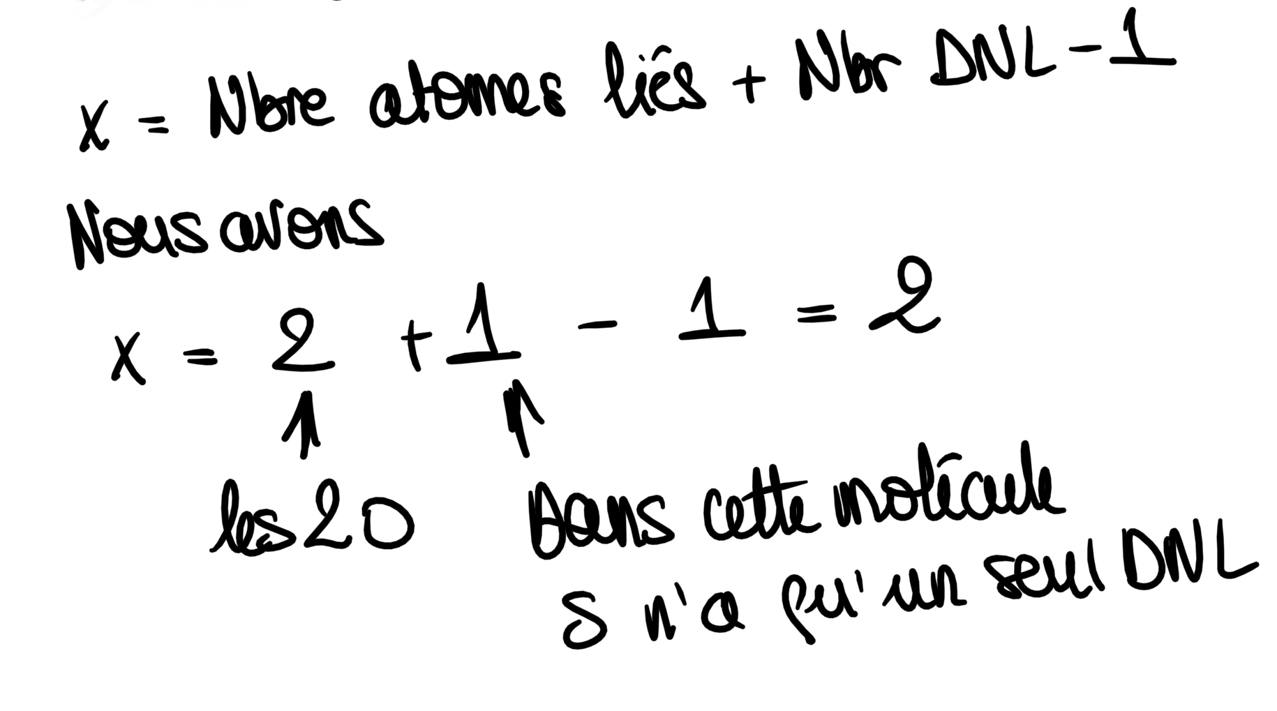 perseya Posted Monday at 02:04 PM Author Posted Monday at 02:04 PM 4 minutes ago, lena'sista'cétylcholine, said: Oui je crois que je comprends, Dans un cas je ne peux pas t'aider parce que j'ai le même problème. Si c'est comment déterminer la géométrie de la molécule à partir du numéro atomique de ses atomes uniquement (pour ensuite déterminer l'hybridation. J'ai posé tellement de fois cette question ! (Je vais essayer de trouver le post d'il y a quelques jours pour te le mettre si comme moi c'est cette notion que tu comprends pas J'avoue que je ne me suis pas plus penchée sur la question étant donné que j'avais terminé mes QCMS quand j'ai reçu la réponse donc je serai bien incapable de te réexpliquer Dans l'autre cas j'ai pas compris ce que tu n'as pas compris et est ce que tu peux préciser ? Par contre ce que je voulais t'expliquer ce n'est pas les liaisons pi et sigma en fonction du nombre de liaison mais que dans la formule : x = Nombre de liaisons autour de l'atome central + nb de DBNL - 1), le nombre de liaisons autour de l'atome, une liaison double comptera pour 1 de même qu'une triple donc si je détaille O=S=O On a 2 double liaisons autour de S (soit 4 liaisons, mais comme on considère qu'une double liaison compte autant qu'une simple dans la formule, on comptera 1 + 1 liaison autour de l'atome de souffre) 0 DBNL Soit x = 2 + 0 - 1 = 1, hybridation sp Mais comme je le disait au départ, si ce qu'il te manque c'est comment on fait pour trouver que la molécule de SO2 a cette géométrie, je te mets le post auquel on m'a répondu il y a quelques jours (si j'y arrive mdrrrr) Je ne pense pas que je confonds l'OL et l'hybridation, car je comprends bien la différence entre: le nombre d'électrons sur les orbitales liante / antiliante (pour l'OL), et le nombre de liaisons autour de l'atome central (→ donc l'hybridation). Ce qui me pose surtout difficulté, c'est de déterminer correctement le nombre de liaisons et de doublets non-liants autour de l'atome central, surtout dans certaines molécules où la répartition des électrons n'est pas évidente pour moi au départ Quote