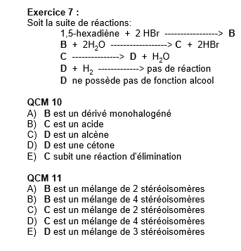 MélineMsy Posted December 21, 2016 Posted December 21, 2016 Salut Pour le QCM 11 : - la molécule B : la réaction qui forme la molécule B est une hydrohalogénation (= addition d'un halogène car Br est un halogène), on se base donc sur le modèle de l'addition de HCl vu dans le cours. Lors de cette réaction, l'hydrogène attaque en premier et permet de former le carbocation plan sur lequel vient s'ajouter Br. comme le carbocation est plan, Br peut attaquer aussi bien au dessus qu'en dessous, ainsi il y a formation d'un carbone chirale. Mais il ne faut pas oublier que ceci se produit 2 fois (une fois sur chaque double liaison de la molécule de départ). On a donc la molécule B avec 2 carbones chiraux qui peuvent être S ou R (donc 4 stéréoisomères) mais ces carbones chiraux possèdent exactement les mêmes substituants et la molécule est symétrique il y a donc une forme méso. Lors de cette réaction l'addition n'est pas trans - la molécule C : les atomes Br sont remplacés par OH il y a donc aussi 3 stéréoisomères Pour la question D : je n'arrive pas à trouver le nombre de stéréoisomères car je ne trouve pas l'aspect de la molécule D par contre dans mon poly de TD l'item 10 D est compté faux donc ce n'est pas un cétone, peut être un aldéhyde ? je n'arrive pas à trouver désolé... En espérant t'avoir aidé