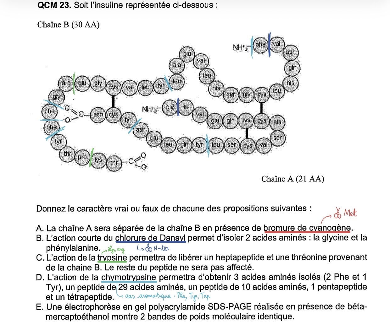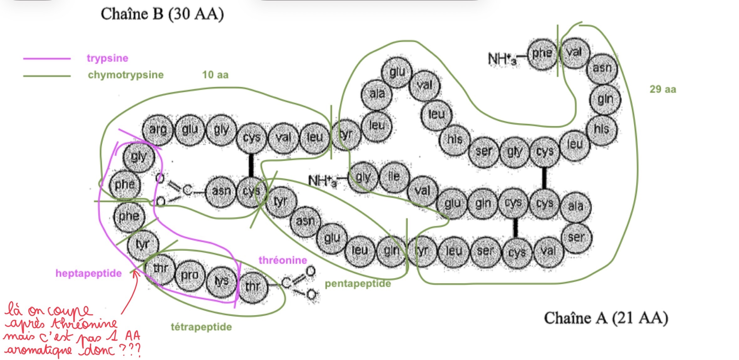mezzanine Posted Monday at 08:56 PM Posted Monday at 08:56 PM Coucou! Je ne comprends pas bien l’item C et le D également. Pour le C on considère qu'il est juste même si il n'y a pas écrit qu'une lysine est aussi libérée. Pour le D je ne comprends pas pourquoi il y a une découpe après la thréonine puisque ce n'est pas un acide aminé aromatique. Quote