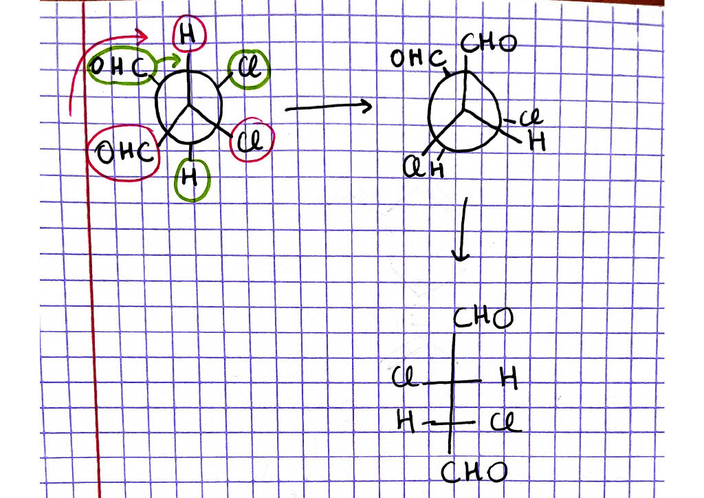 Non le Cl du carbone 2 est toujours à gauche tant que tu regardes ta molécule avec les deux CHO en arrière. C'est juste ensuite, quand tu détermines la configuration des carbones asymétriques en Fisher, que tu inverses dans quel sens tu tournes visuellement (tu peux faire 3-->2-->1 au lieu de l'inverse que tu fais normalement) car le groupement 4 (le H) pointe vers toi, il est devant, de la même manière que le Cl.