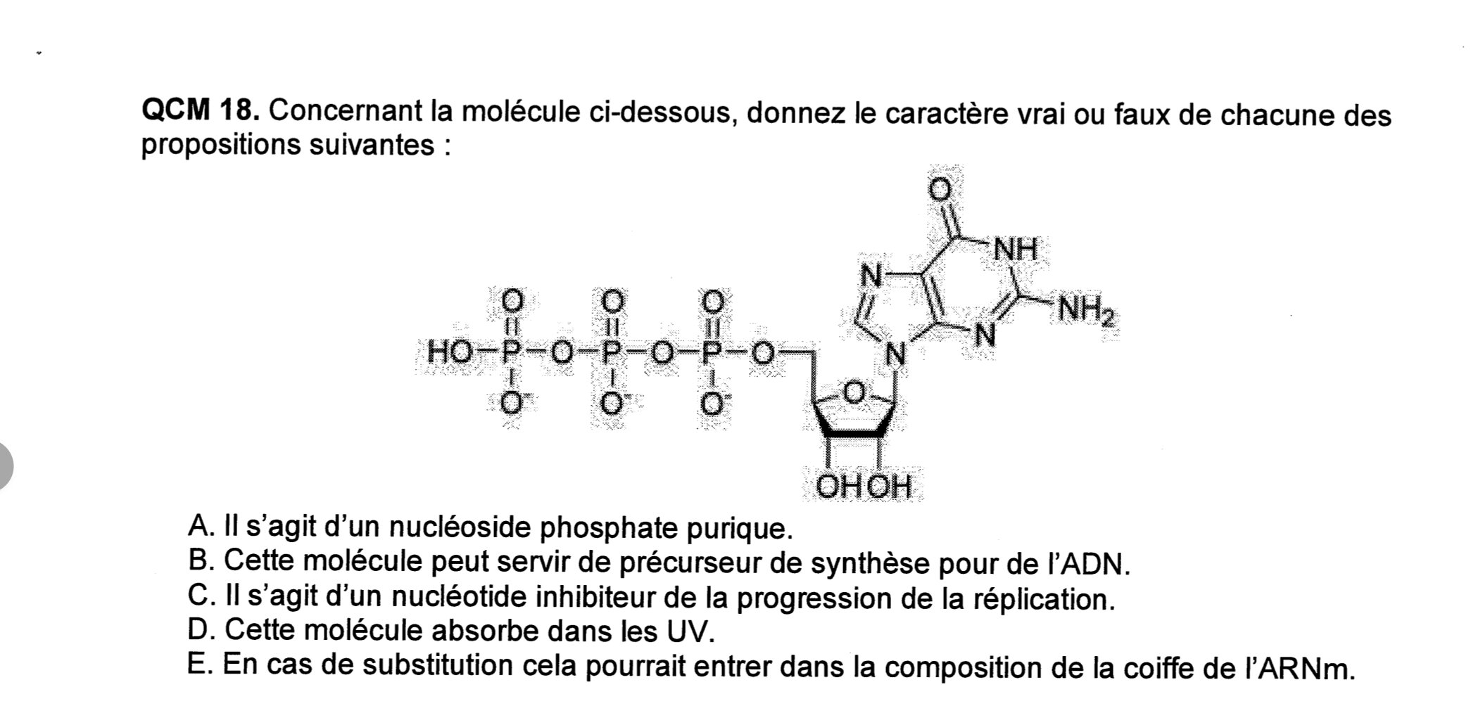 khatabi Posted December 9 Posted December 9 salut ici je ne comprend pas l'item A on dit que ces un nucleoside mais comme ya du phosphate ces pas plutot nucleotide ?? et pour l'item E je ne comprend pas pourquoi c'est vrai Quote