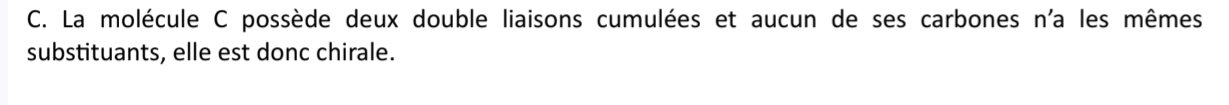 Solution Marcophage Posted Wednesday at 03:01 PM Solution Posted Wednesday at 03:01 PM (edited) Salut @_lala_, il s'agit d'un cumulène (notion hors programme), C'est une molécule avec au moins 2 doubles liaisons consécutives. Mis à part qu'ils sont très rigides et linéaire, dans le cas très précis où ils ont un nombre pair de doubles liaisons et deux substituants différents sur chacun des carbones terminaux, ils deviennent alors chiraux sans même avoir de carbone chiral. Il faut visualiser les deux doubles liaisons tournés à 90° de façon a formé une croix. ex: H H \ / C = C = C / \ H3C CH3 Bonnes révisions Edited Wednesday at 03:05 PM by Marcophage MaHelicase and Ankyyrine 1 1 Quote