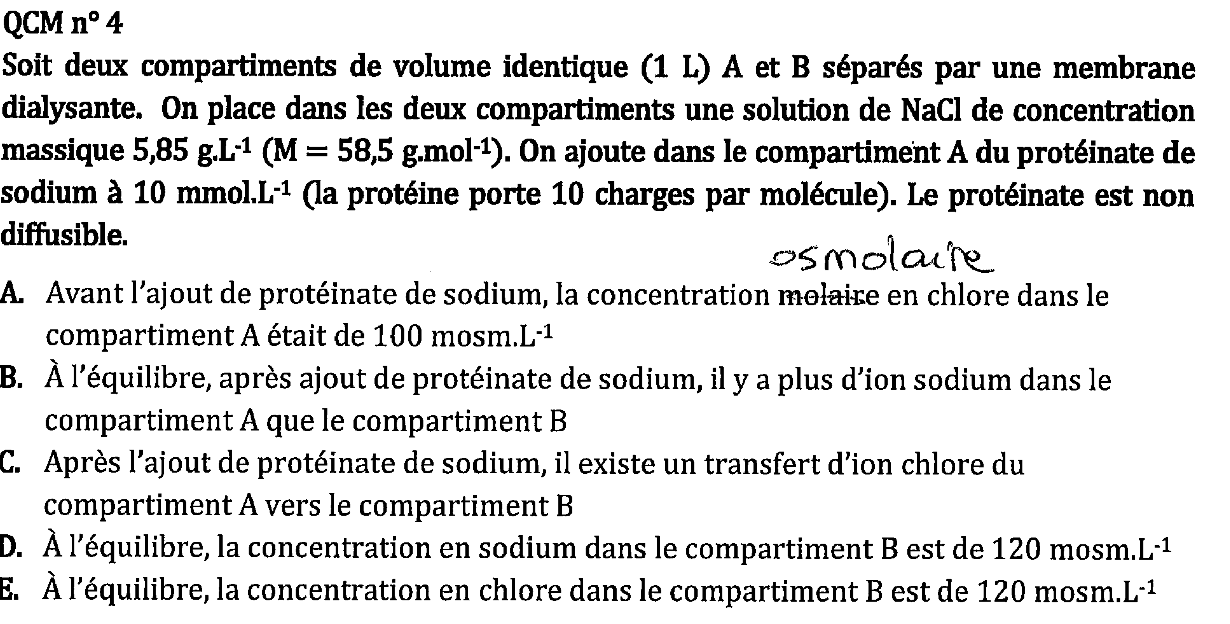 Tuteur Solution aangelee Posted Thursday at 01:50 PM Tuteur Solution Posted Thursday at 01:50 PM Coucou, Dans ce qcm, on travaille ion par ion, pas sur « NaCl » globalement donc pas besoin du coefficient d’ionisation ici. NaCl est traité comme électrolyte fort, totalement dissocié, comme dit dans ton cours → α ≈ 1. As tu besoin d'une correction détaillée pour chaque item ? Cotytylédon 1 Quote