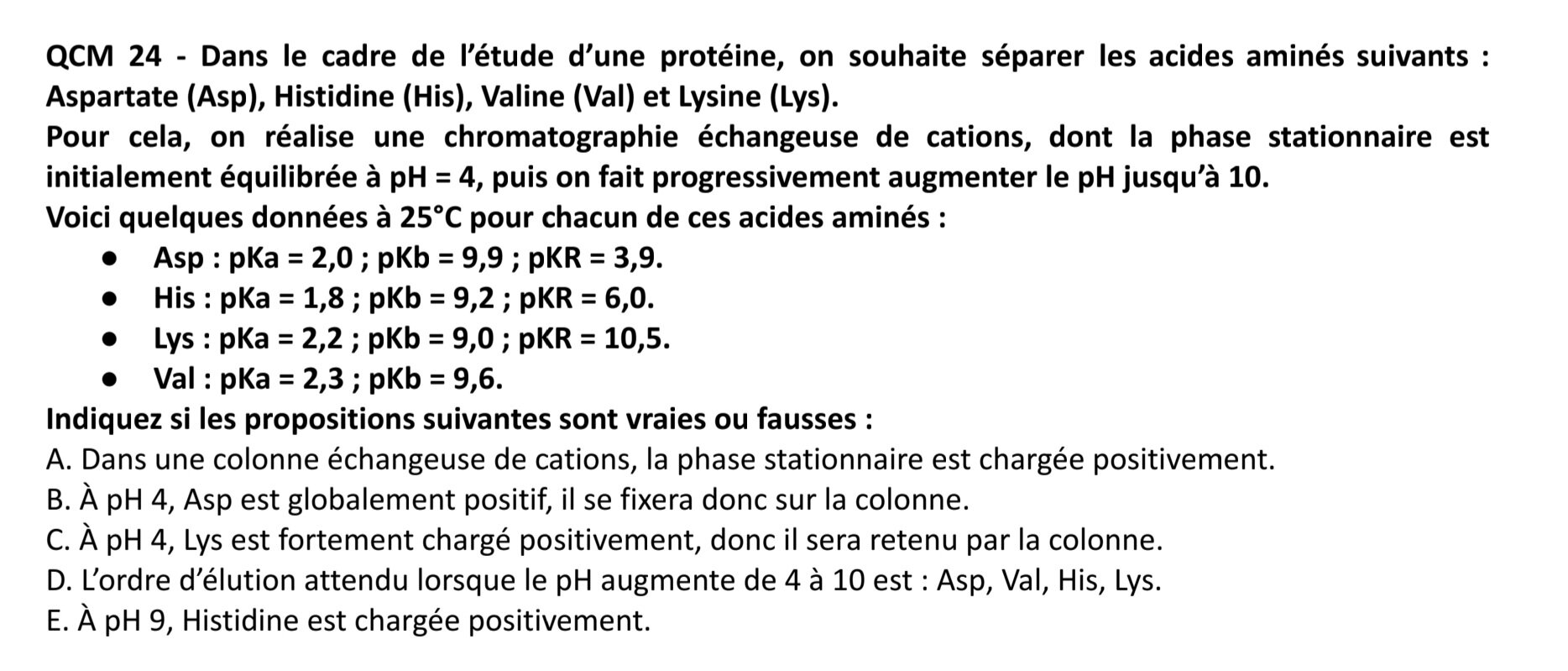 Ça_PASS_ou_ça_casse Posted 15 hours ago Posted 15 hours ago Coucou! Je fais le QCM 24 du sujet 1 du poly de l’avent, mais je ne trouve pas une réelle réponse à ma question en fouillant dans le forum... L'item D est compté comme vrai. Un tuteur à répondu comme quoi, même si le pHi de l’AA était inférieur au PH de la phase stationnaire, c'était le premier à être élué puisque son pHi ne lui permet pas de se fixer... MAIS, il est précisé dans l'item que l'on augmente le pH de 4 à 10 ; et dans ce cas là, il me semblait que comme on précise que l'on commence à un certain pH, si le pHi de l’AA n'était pas compris dedans, alors on ne le prenait pas en compte... Je me trompe peut être ? Merci de votre réponse ! Quote