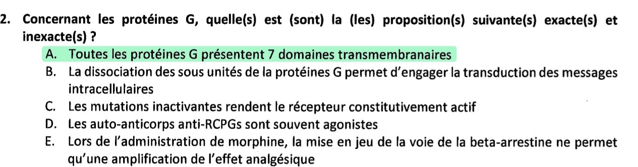 TératomeTerrible31 Posted December 13, 2025 Posted December 13, 2025 Dans l'annale de l'examen S1 2024-2025, au qcm UE6, l'item A : "Toutes les protéines G possèdent 7 domaines transmembranaires" , est compté vrai. Je pensais pourtant avoir compris d'après le cours que c'était le récepteur qui comportait les domaines tansmembranaires, tandis que la protéine G couplée, elle, possède ses trois sous-unité αβγ. Quote
