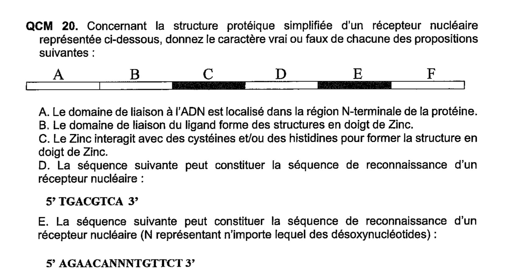 Tuteur Solution Lune_ Posted Sunday at 05:30 PM Tuteur Solution Posted Sunday at 05:30 PM Coucou ! Pour compléter la réponse précédente, la séquence de reconnaissance d'un récepteur nucléaire qui doit avoir une répétition de base espacée de plusieurs nucléotides, elle peut être direct (même séquence) ou indirect (séquence complémentaire). Pour que l'item D soit vrai on doit avoir: 5'TGACnnnGTCA3'. On serai sur le cas d'une répétition indirect où la partie répétée est une séquence complémentaire. C'est pourquoi la D est fausse. Et tu retrouves ce schéma pour l'item E, qui est donc juste. Androma 1 Quote