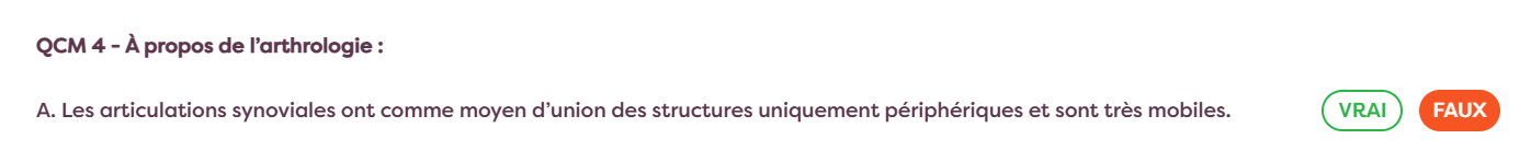 Je ne comprends pas pourquoi cet item est compté vrai ? Sachant qu'on ne trouve pas "uniquement" des structures d'union qu'en périphérique pour ce genre d'articulation mais aussi les ménisques qui sont intérieures. Peut être que j'ai loupé quelque chose