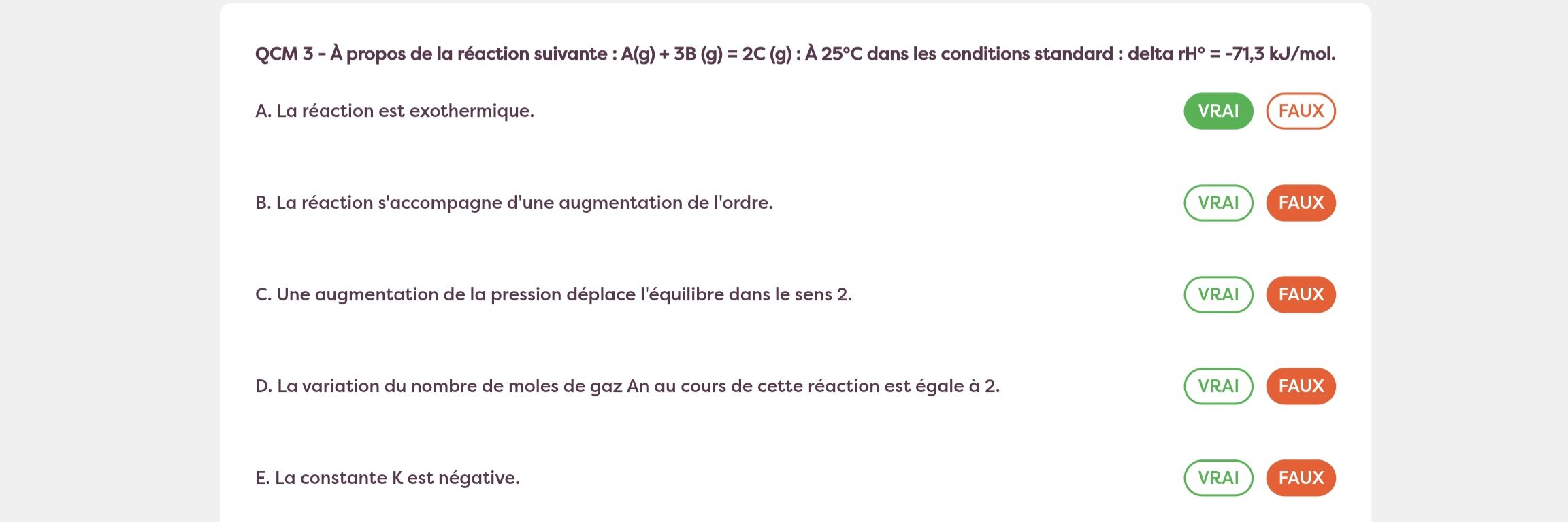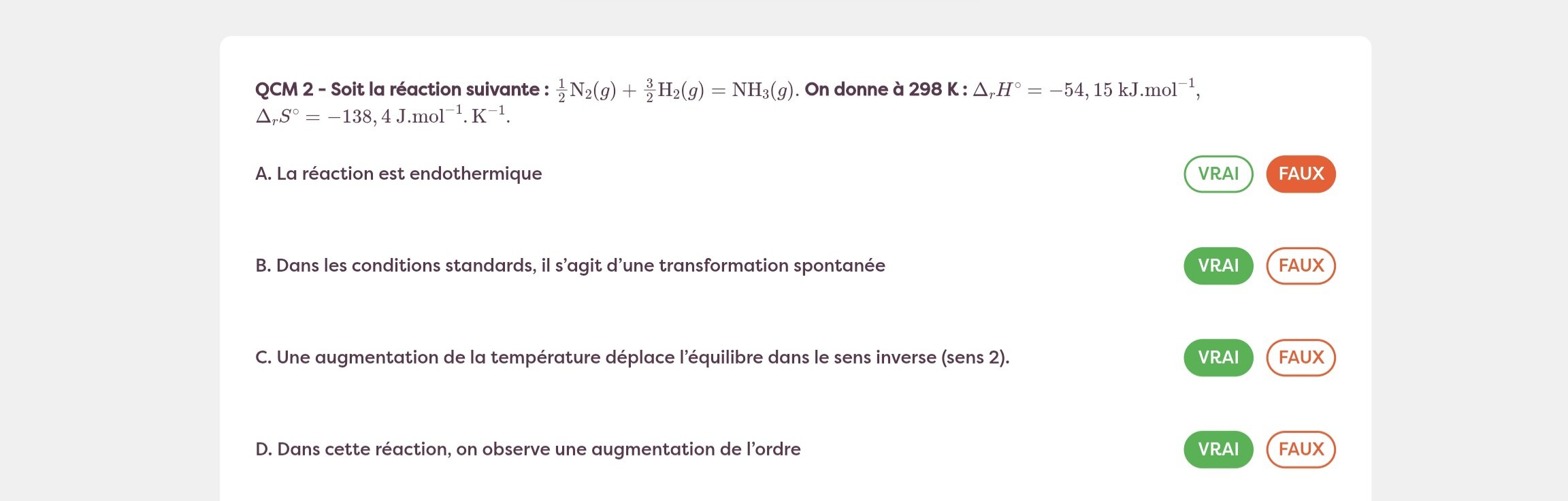 Responsable Matière Solution Aaronigashima Posted Saturday at 05:57 PM Responsable Matière Solution Posted Saturday at 05:57 PM Salut, le 1er QCM a une errata, effectivement quand drS < 0 ou que le nombre de moles de gaz diminue (ce qui est équivalent) on a une diminution du désordre, soit une augmentation de l’ordre. Si tu pouvais signaler le QCM (ou quelqu’un d’autre quand il le verra sur la plateforme) ça me permettra de corriger cela. Bonne journée ! indécis 1 Quote