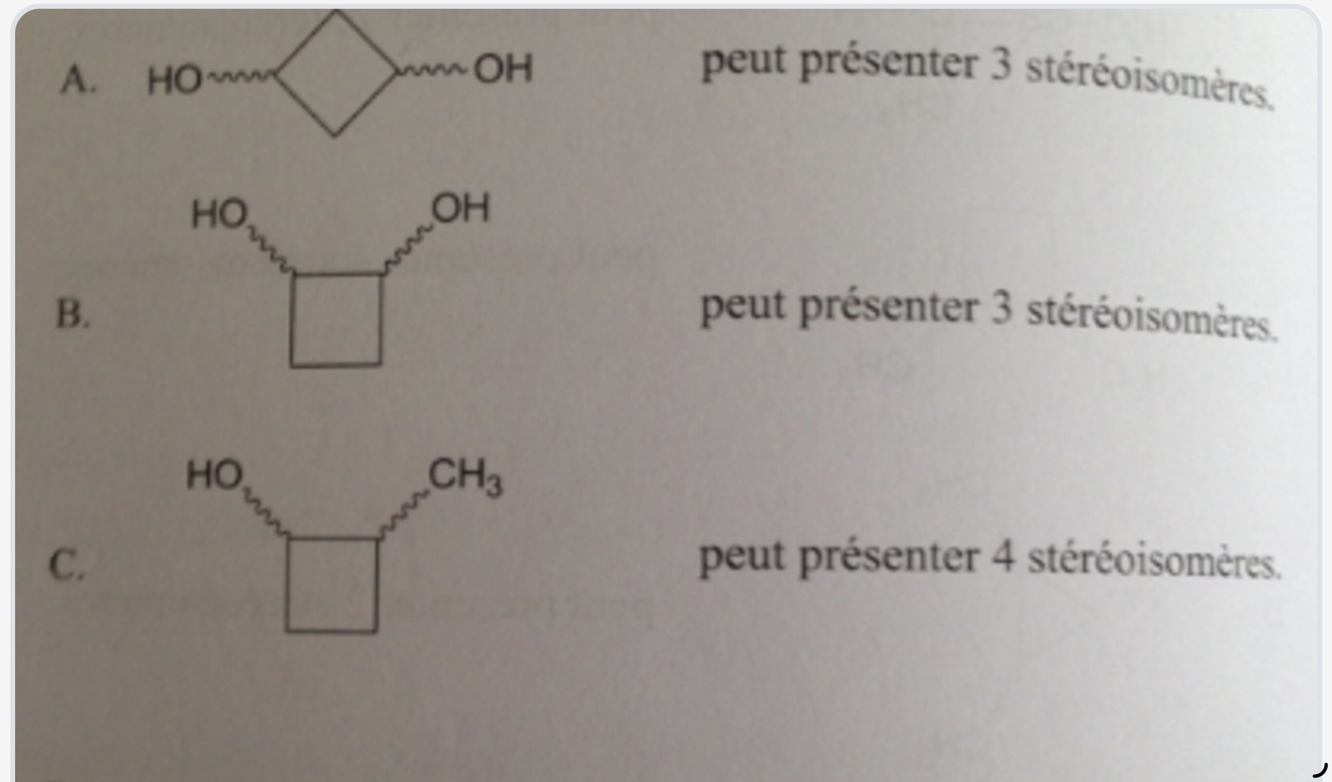 Maribozyme Posted January 13 Posted January 13 Bonjour, pour ce QCM en pièce jointe, je ne comprends pas pourquoi la 1 et la 2 sont vraies, si il y a 3 stéréoisomères ça veut dire que c’est des formes méso ? sur ce QCM : La A est marquée vraie mais pour moi on ne peut pas avoir de saut de la liaison du cycle à la position en liaison avec le C. Pour la D c’est marqué faux mais pourtant ça me parait correct je vois pas le problème. Merci ! Quote